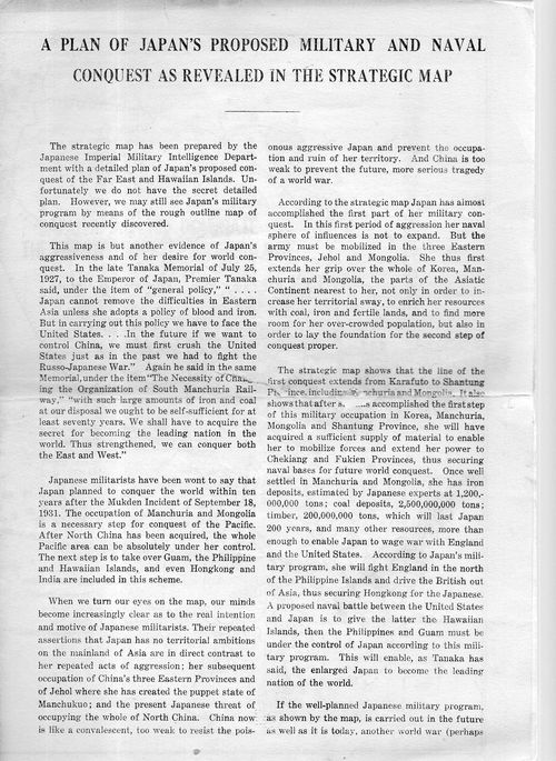 A Plan of Japan's Proposed Military and Naval Conquest as Revealed in the Strategic Map appears no later than 1933. The single-sheet folded pamphlet contains two pages of text along with the middle two sheets of the map, "Japan's Aim to Dominate the Far East and Pacific Islands". The document was part of a very large collection I bought of the Library of Congress, and according to the pencil notes on the pamphlet it was sent to the L.C. by the "Kuo Min Tang" on May 13, 1933. (It was curious to see the KMT referred to as though it was someone's name, rather than a political party begun in the People's Republic of China in 1894.)