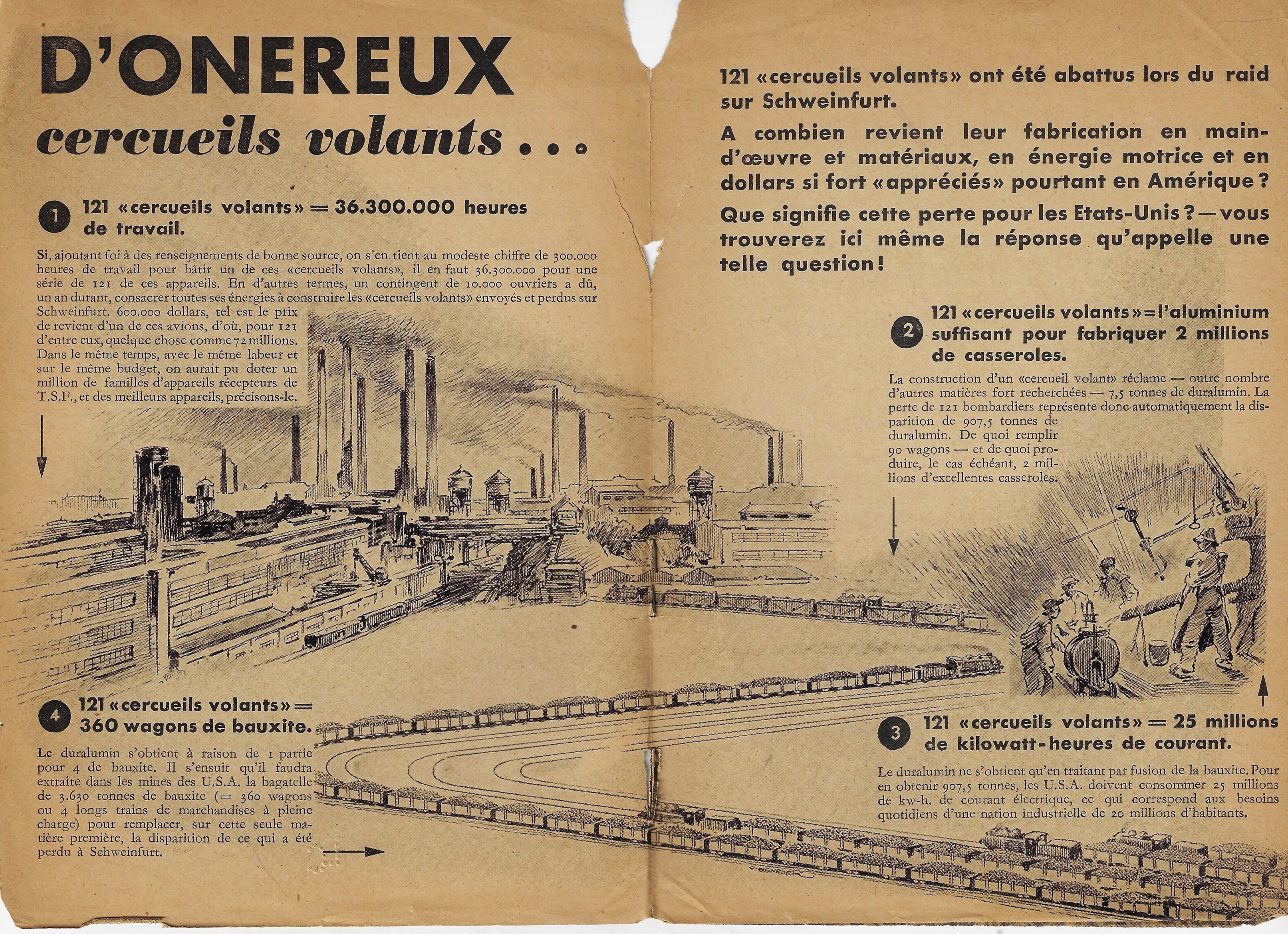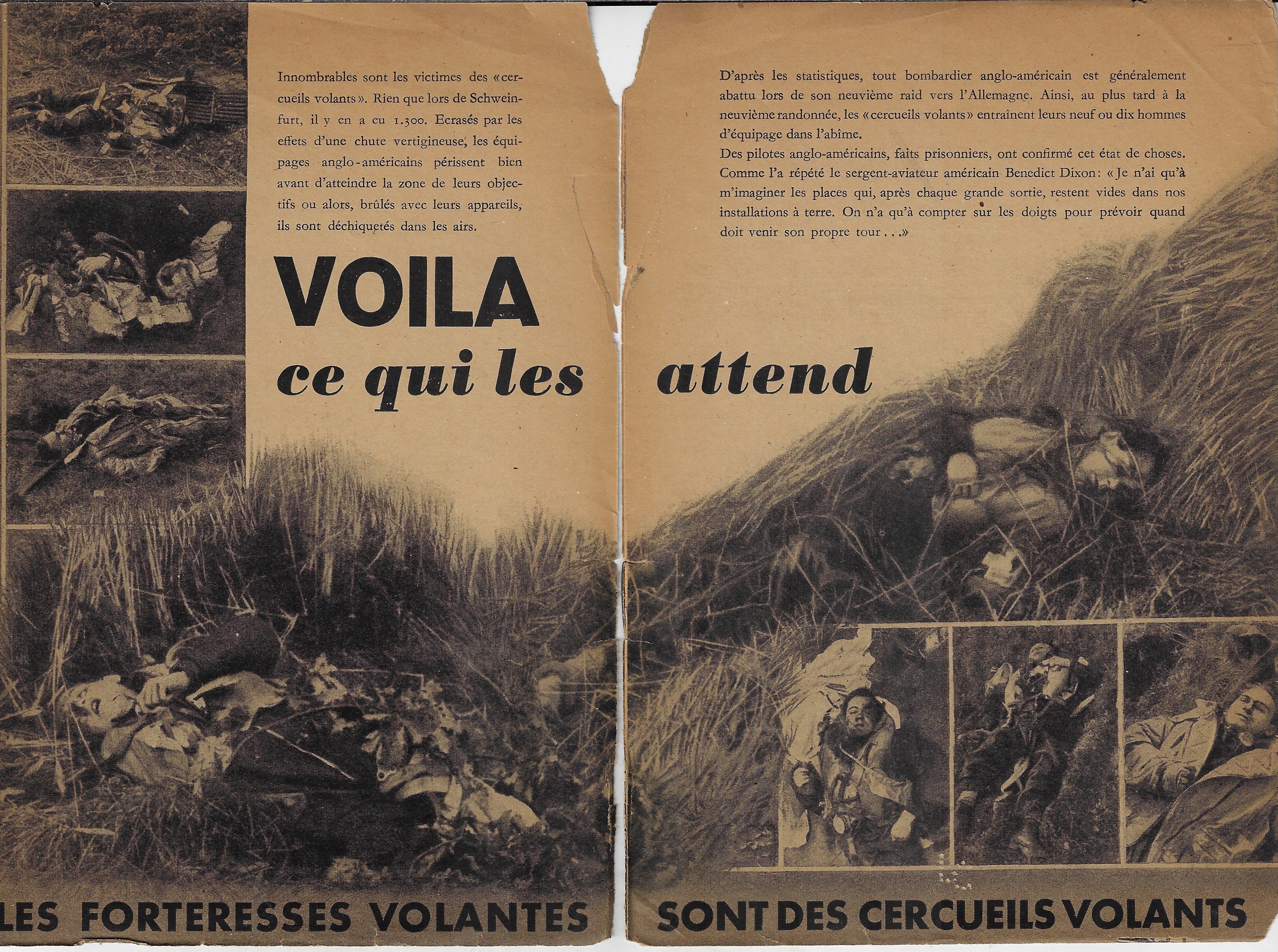 The next scene, a two-pager, is heartbreaking and brutal. “Voila ce qui les attend” it shouts--”this is what awaits them”! And then, boldly beneath the scene, the pamphlet repeats the Flying Fortress is the Flying Coffin claim.