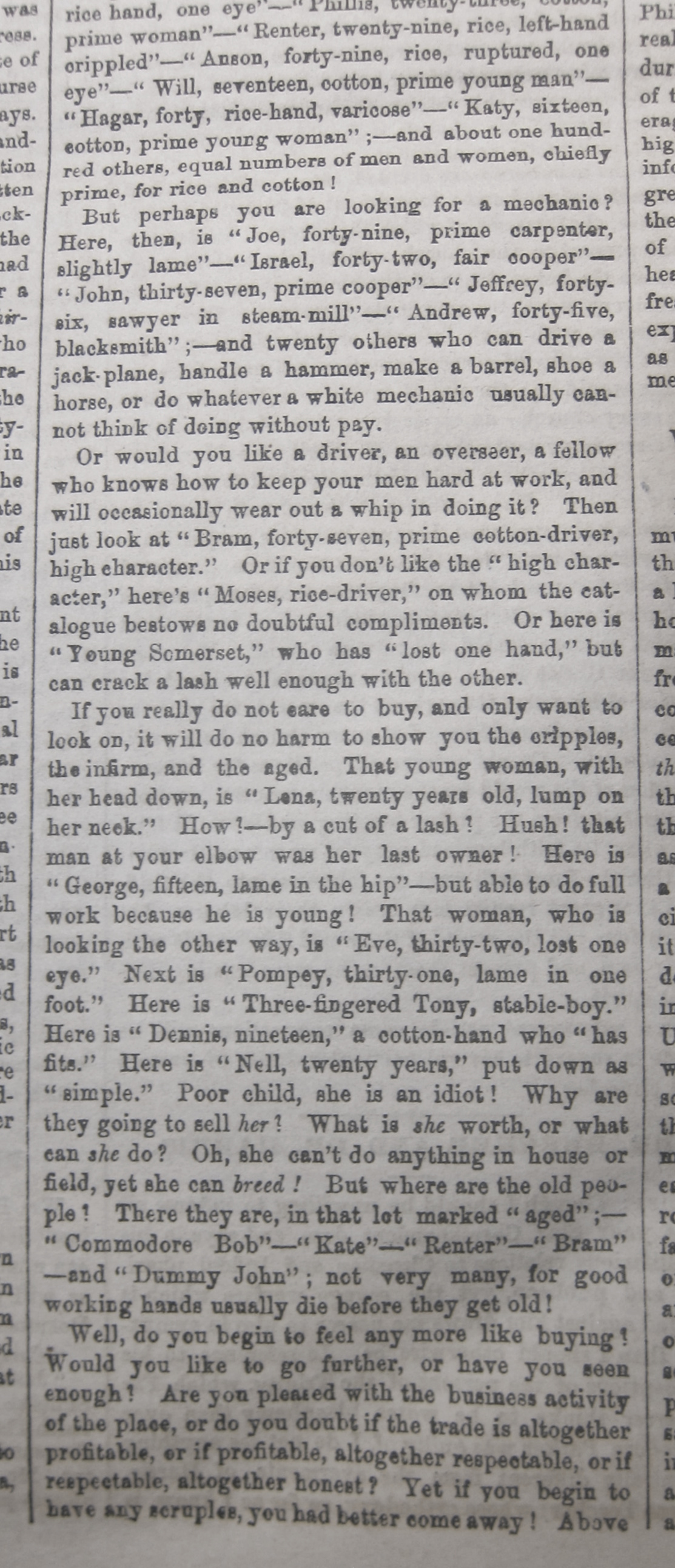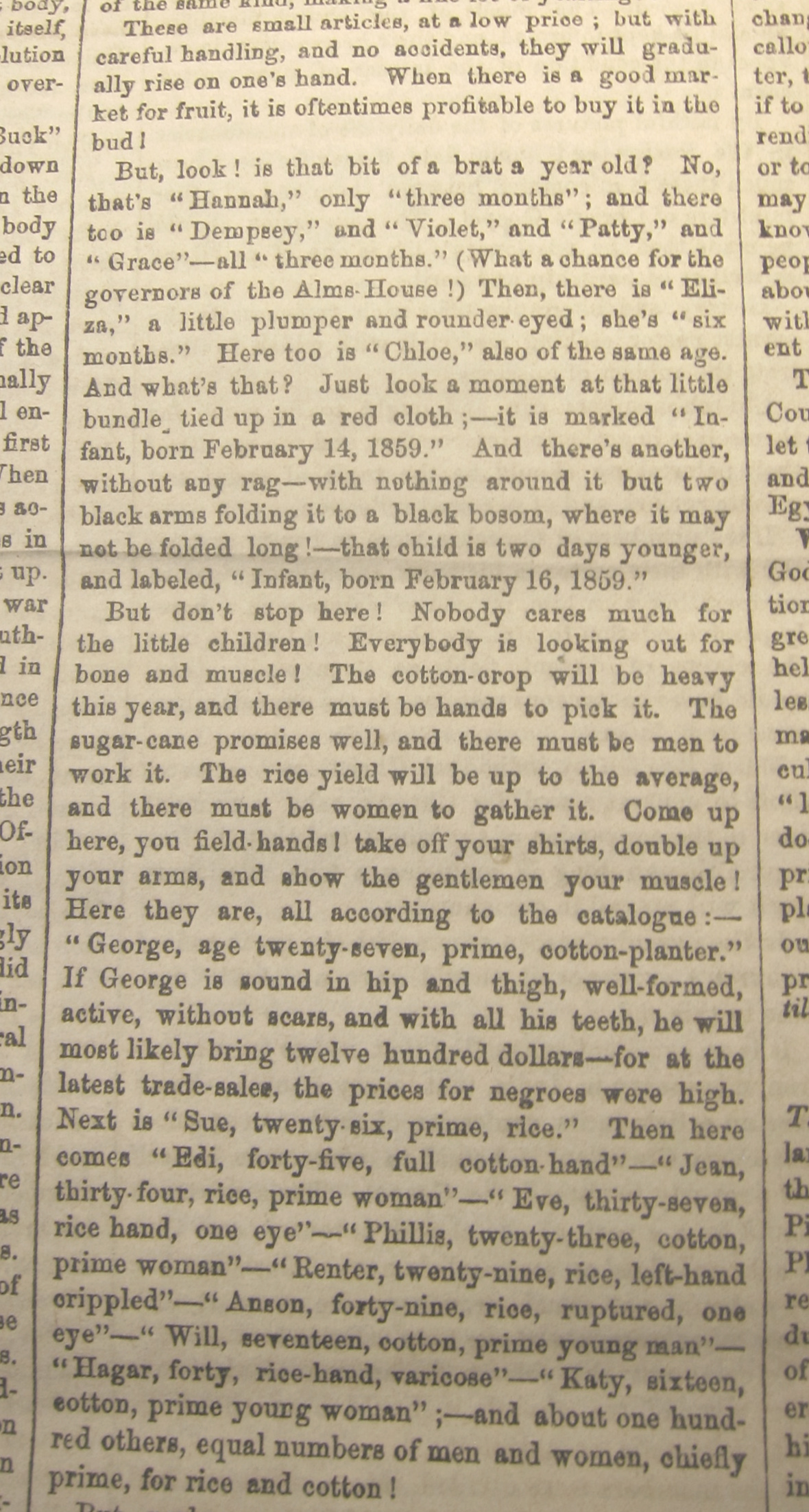 The pseudonymous reporter (the article signed “T.T”) notices the details of those in charge of the proceedings, some of the aspects of the crowd, though mostly the descriptions are focused on the poor people waiting to be sold...and then, mostly that on the children, and the infirmed.