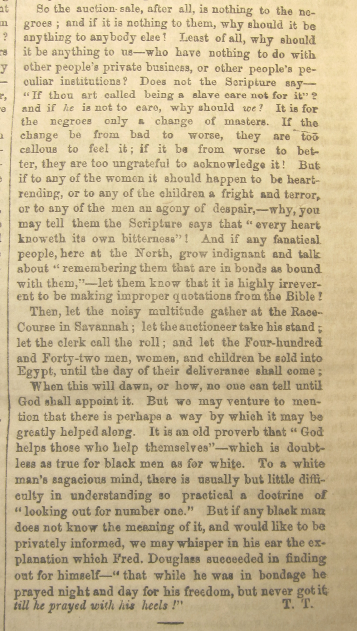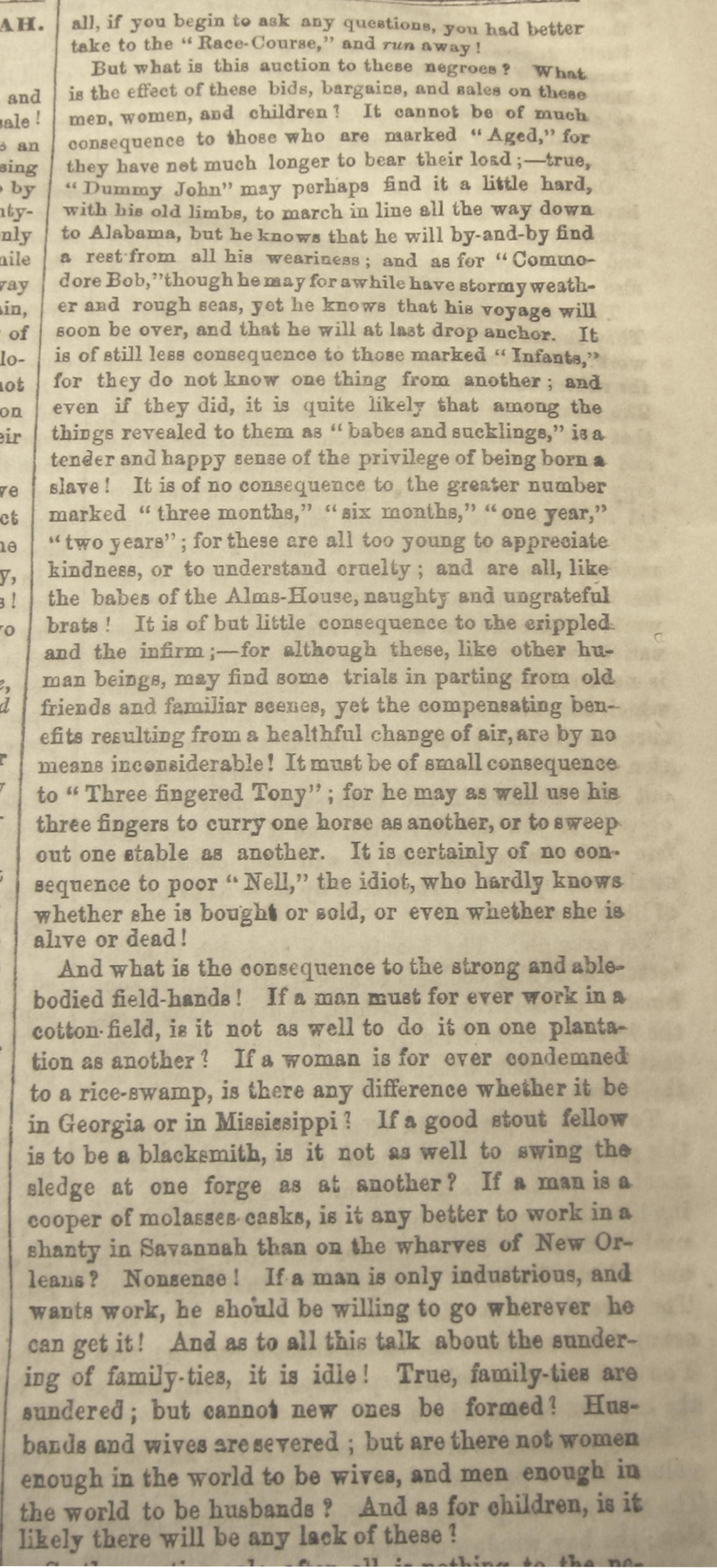 The article, “The Great Slave Sale at Savannah2”(the sale itself also referred to as “the Weeping Time”) appeared on 10 March 1859, about a week after the two-day event was held in a driving rain at the Ten Broeck Race Course, about two miles west of downtown Savannah. The slaves were the “property” of Pierce Mease3 (1810-1867), a profligate Georgia aristocrat who led himself to ruin, the slave sale intended to restore his economic condition. The sale was held at a race track