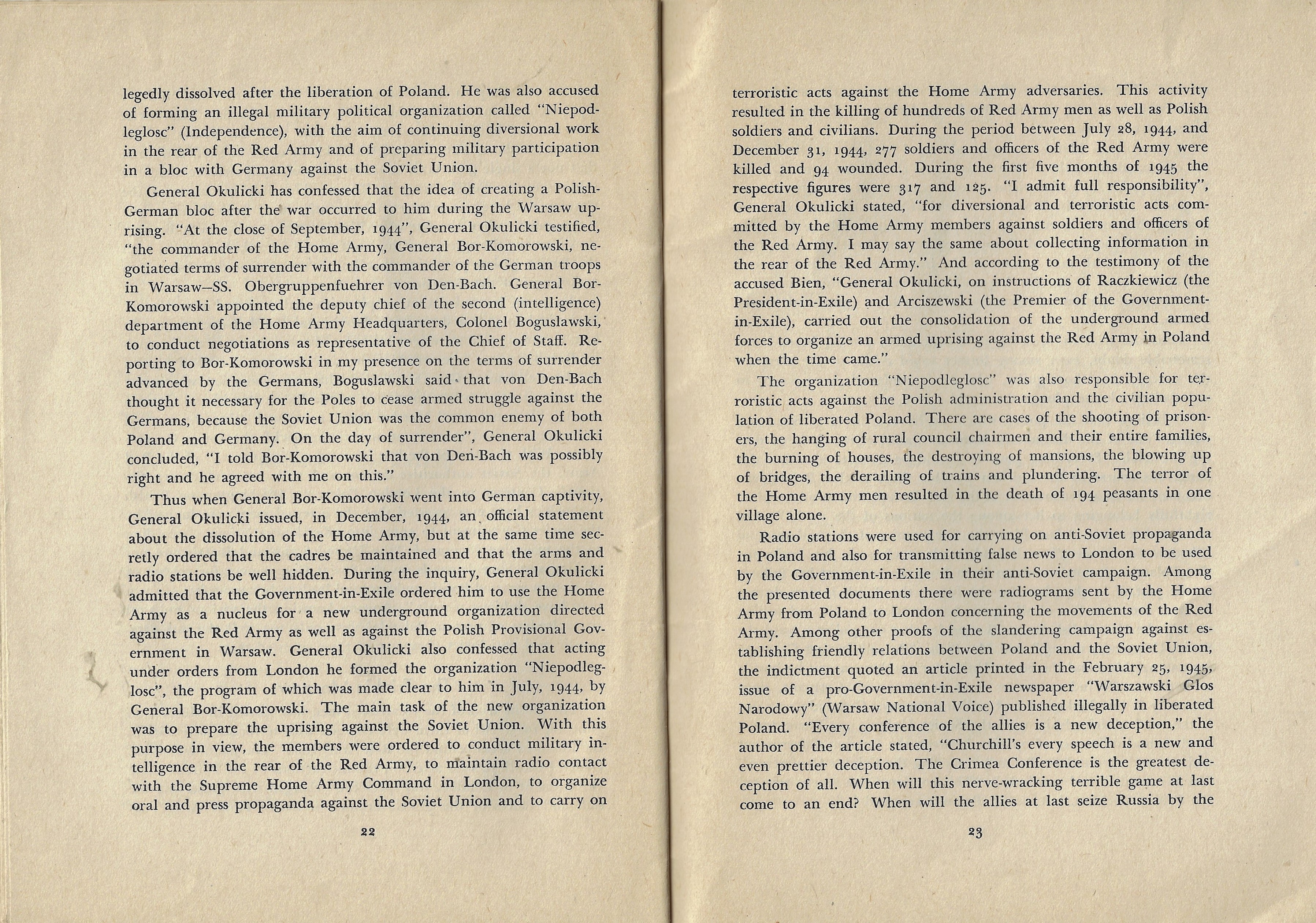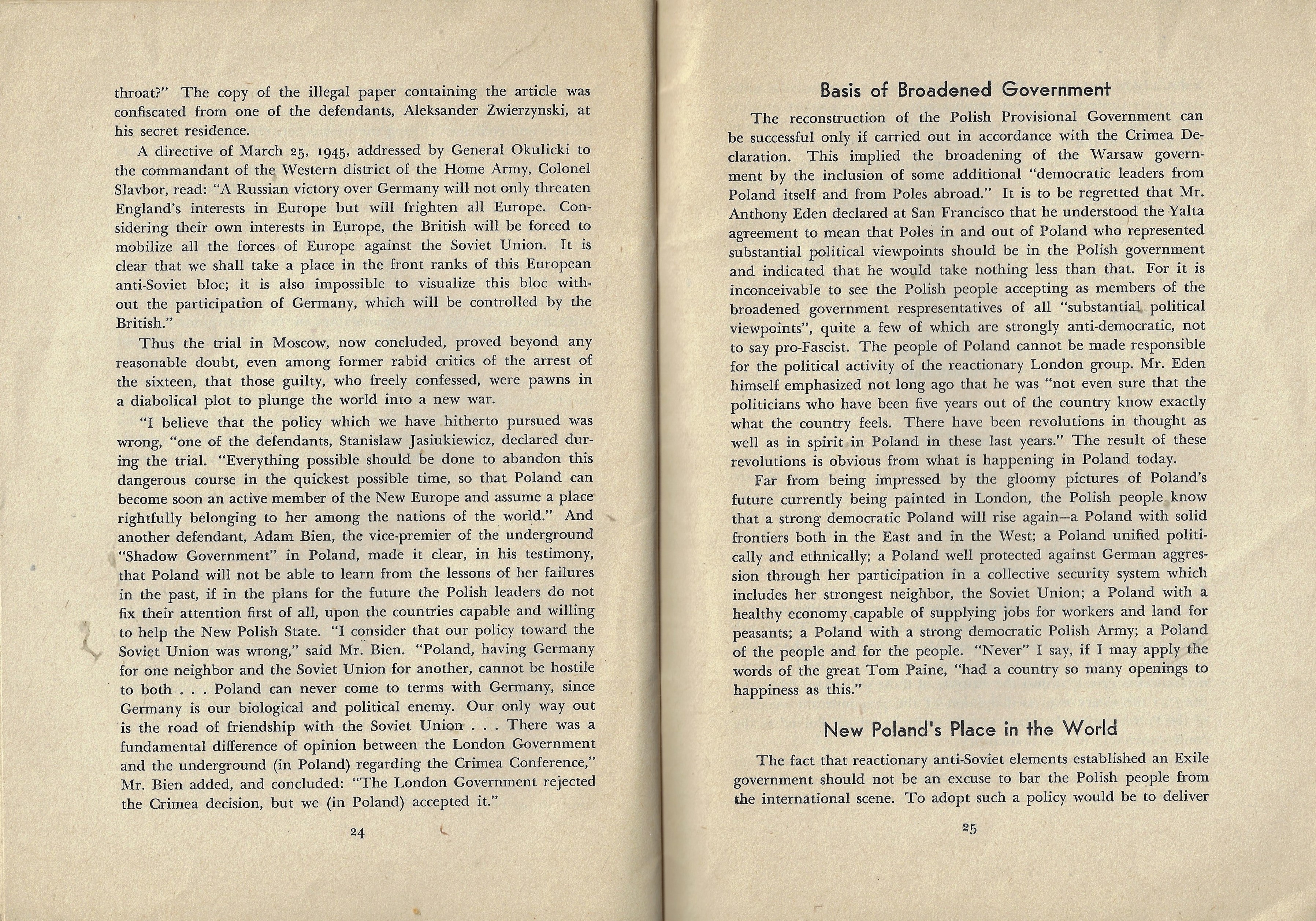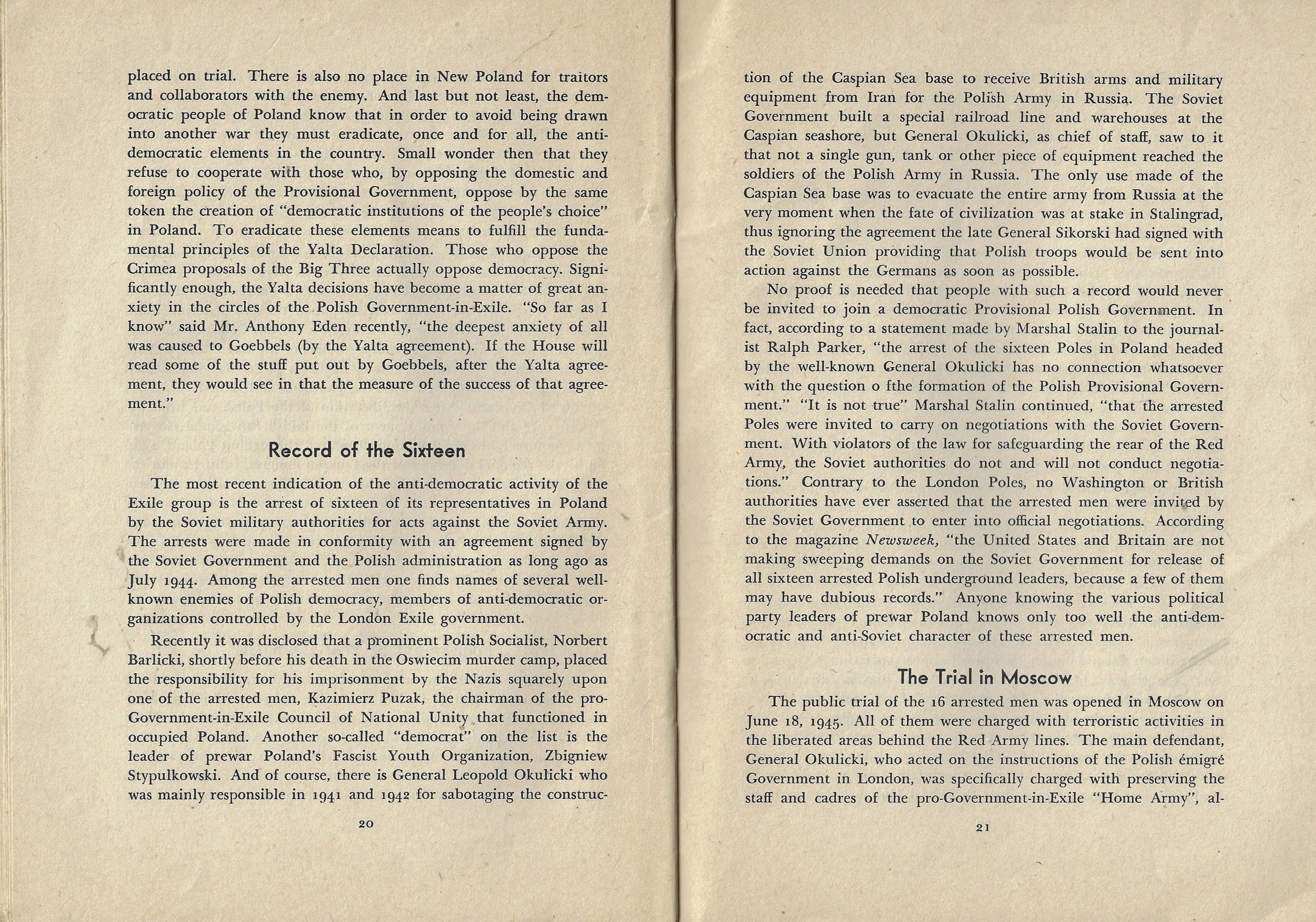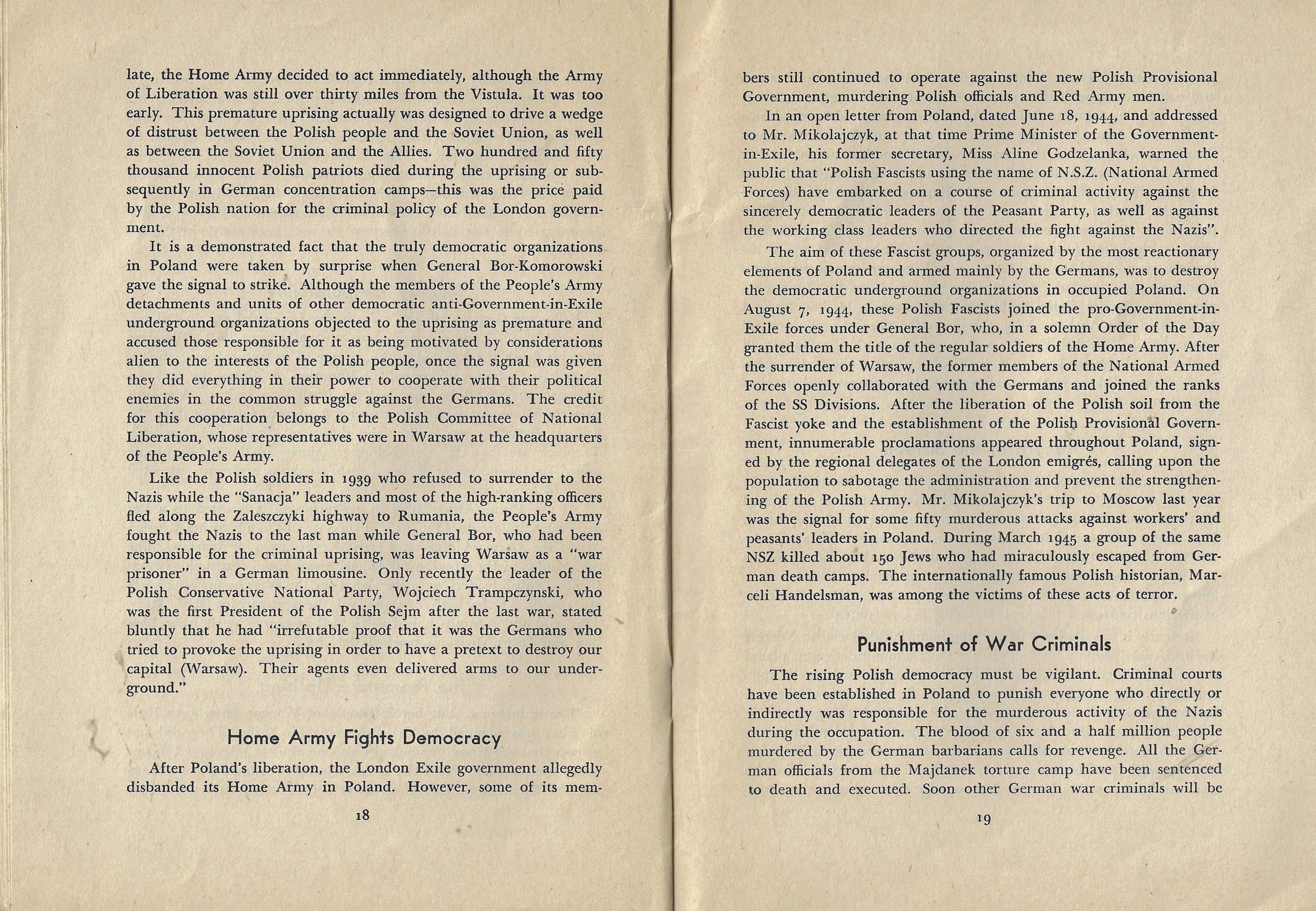 There's a lot of difficulty in this work's 29 pages, all of which are ultimately directed against the still-extant Polish government in exile (in London) insisting that those are the anti-democratic and anti-Soviet forces at work in Poland. The write, a physicist named Ignace Zlotowski is the author, and he makes an abundant case for the London government setting out to destabilize (and de-Stalinize) the “New Poland”.