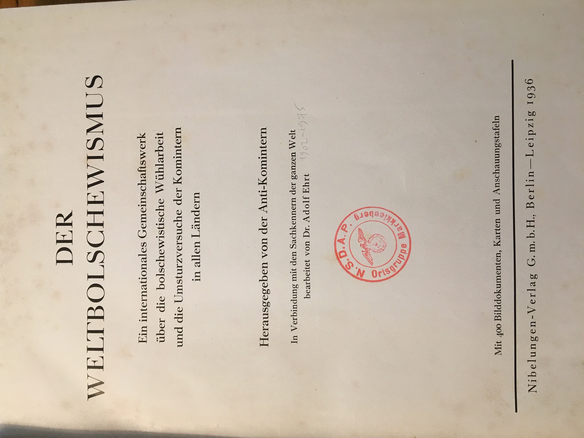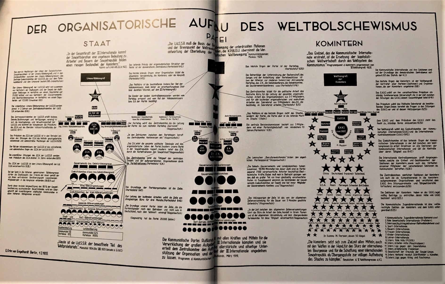 Here are two renderings of what Nazis envisioned to be the structure of the Communist Party, the first being for Germany, and the second for found orchestrated Communism worldwide. They are located in a half-grubby if not heavy book by the propagandist Adolf Ehrt's called Die Weltbolshewismus, which was published in 1936.
