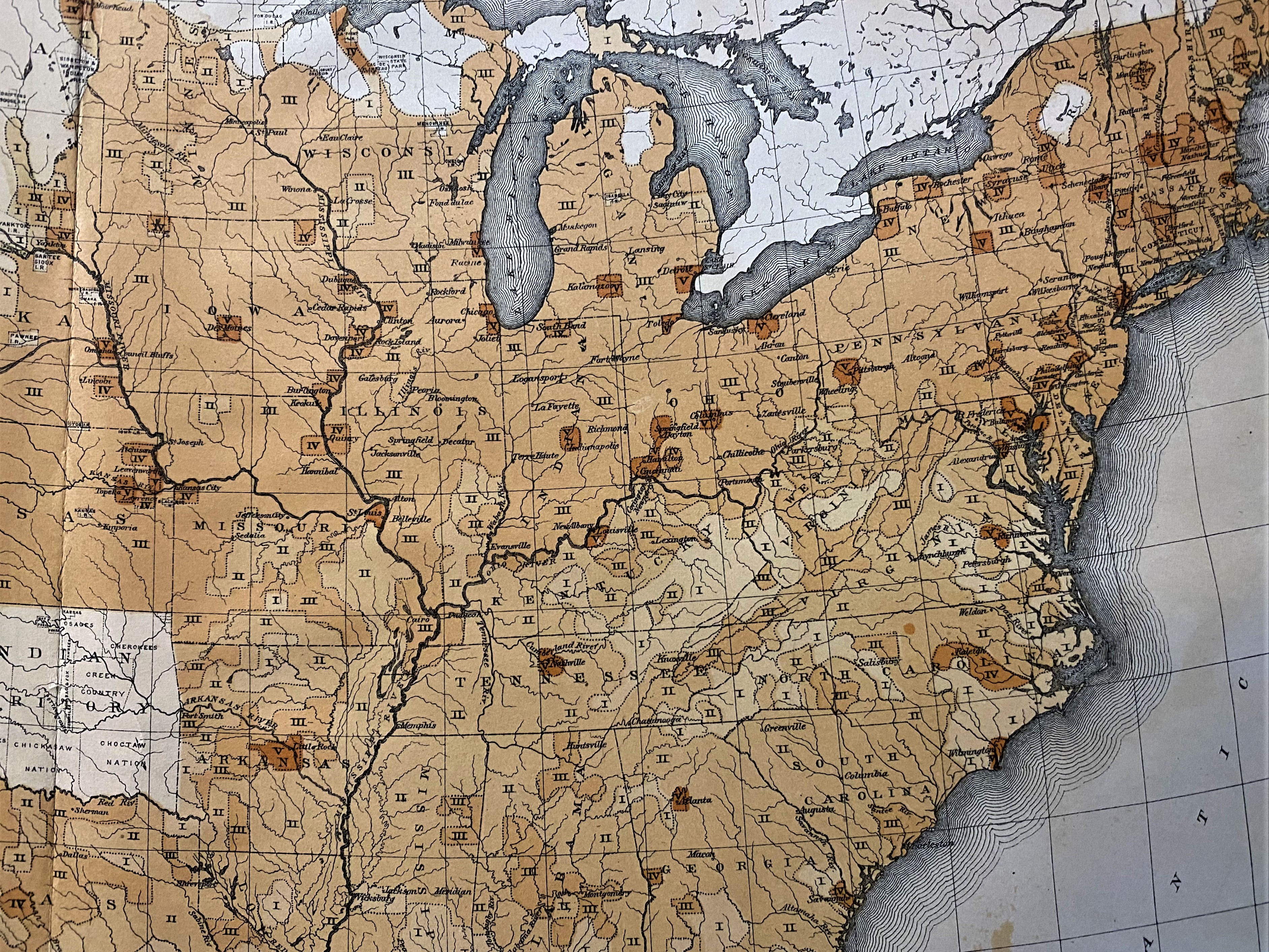 This wide expanse of white and unmodified map space exhibits the more-or-less total absence of daily (or weekly) newspapers in the West and Far West of the U.S. in 1880. The measure of the gradient colors depict the "newspaper per capita of population, the "absence of color indicate a population of less than two people to a square mile, being practically an absence of settlement". making up about a third of the country.
