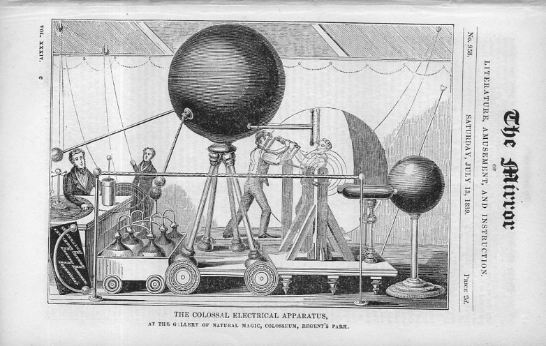Here's an interesting combination of sweat and electricity--an enormous electrical device that was on display in an exhibit of "natural magic" at the Colosseum in Regent's Park in 1839. The large disk that the two guys are turning is actually larger in real life, being 7' in diameter, the conductor being varnished copper, and the conducting balls being gilded--it must have been a very shiny experience, especially when they generated their electric spark. In 1839 this was the largest electrical generating device in the world. (I have a tiny version of that device here, something made out of old records coated with copper and found ball glasses acting as Leyden jars, all painted and varnished, the work of an 8 year old in 1925 who went on to a career in astronomy and became the most celebrated eclipse follower in the mid 20th century.)
