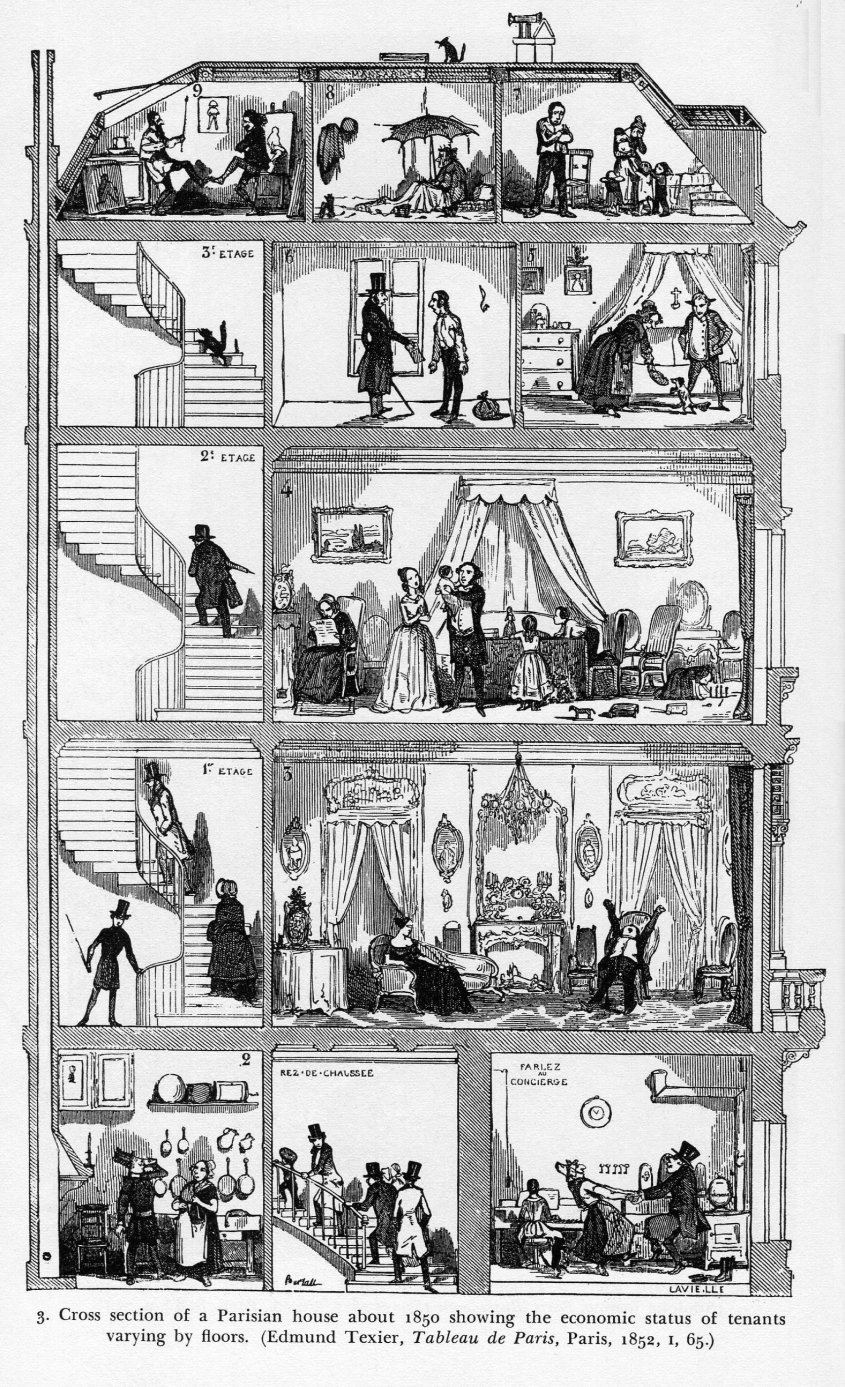 So here they are, the guy on the right is hauling the muck to an elevator shaft at right (more visible in the full version of the woodcut, following), while another fellow shovels, and a third man strands there surveying the scene with arms folded in a pose recognized world-wide at construction scenes. The little squares above them show the cross sections of one row 12"-thick lengths of cut lumber (laid on top of another layer of the same running at a right angle, making 15 layers in all) on top of which stone would be placed.