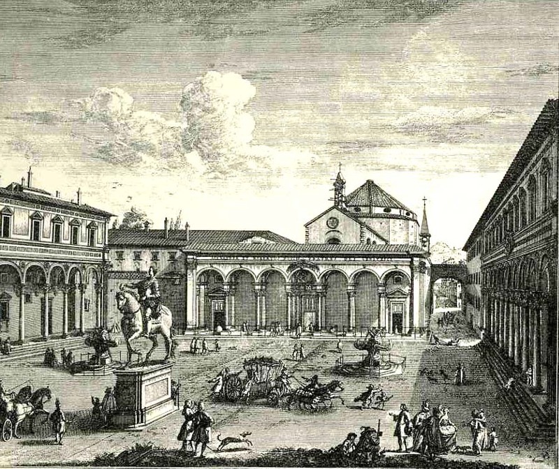 For example in the engraving Veduta della Piazza della SS Nunziata Statua Equeftre di Ferdinando Primo, Fonti, e Loggie Laterall by Giuseppe Zocchi (1711-1767) it would’ve been easier certainly to leave the plaza empty, but Zocchi doesn’t, filling in the empty spaces with several dozen people, most of whom are really rather busy. In addition to royal coaches and animated discussions, we can find a number of unusual images. There is a very curious sub-scene of a women with three children, one of whom seems to be falling, or leaping, the woman holding her hand straight out in front of her. Directly above them we can see a man pulling a small carriage with another person in it. Is this person a child? Are they elderly? Infirmed? And what about the (probably elderly) figure who we can half see, leaning their back against the equestrian statue, holding a staff? Why bother adding half of figure (from the rear)? Why on earth did Zocchi choose to add