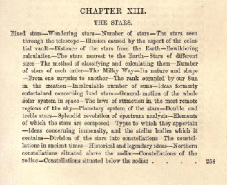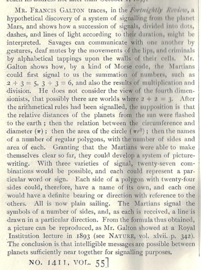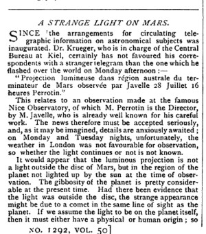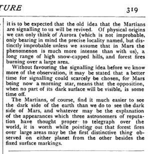 "To account for these wonderful phenomena, the vast powers of Nature were found totally inadequate; and thus it was that Schiaparelli was led to enunciate the idea of the artificial origin of the canals, conceiving the larger of them to be composed of six different watercourses, whose dykes would be opened now and then by the Martian minister of agriculture.”--pg 417