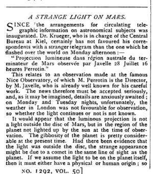 “Speculations of such a character were eagerly embraced by M. Flammarion and other popular Continental writers. Yet it is to be regretted that the originator of this artificial theory, and his imitatore failed to do the utmost with their cherished idea. For, inasmuch as the canals appear straight about the central meridian, and also when carried by rotation near the limb, it is obvious that the Martian engineers would be constantly engaged in rapidly digging and destroying their watercourses, so as to make them look always straight to the observers on the earth. “pp 417-418