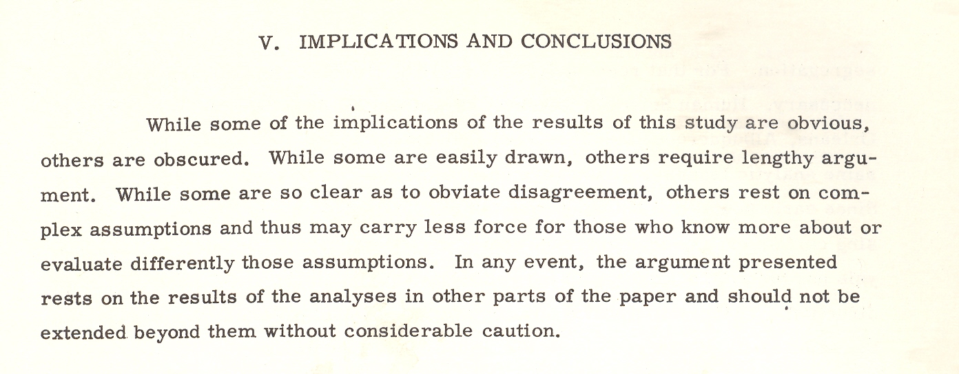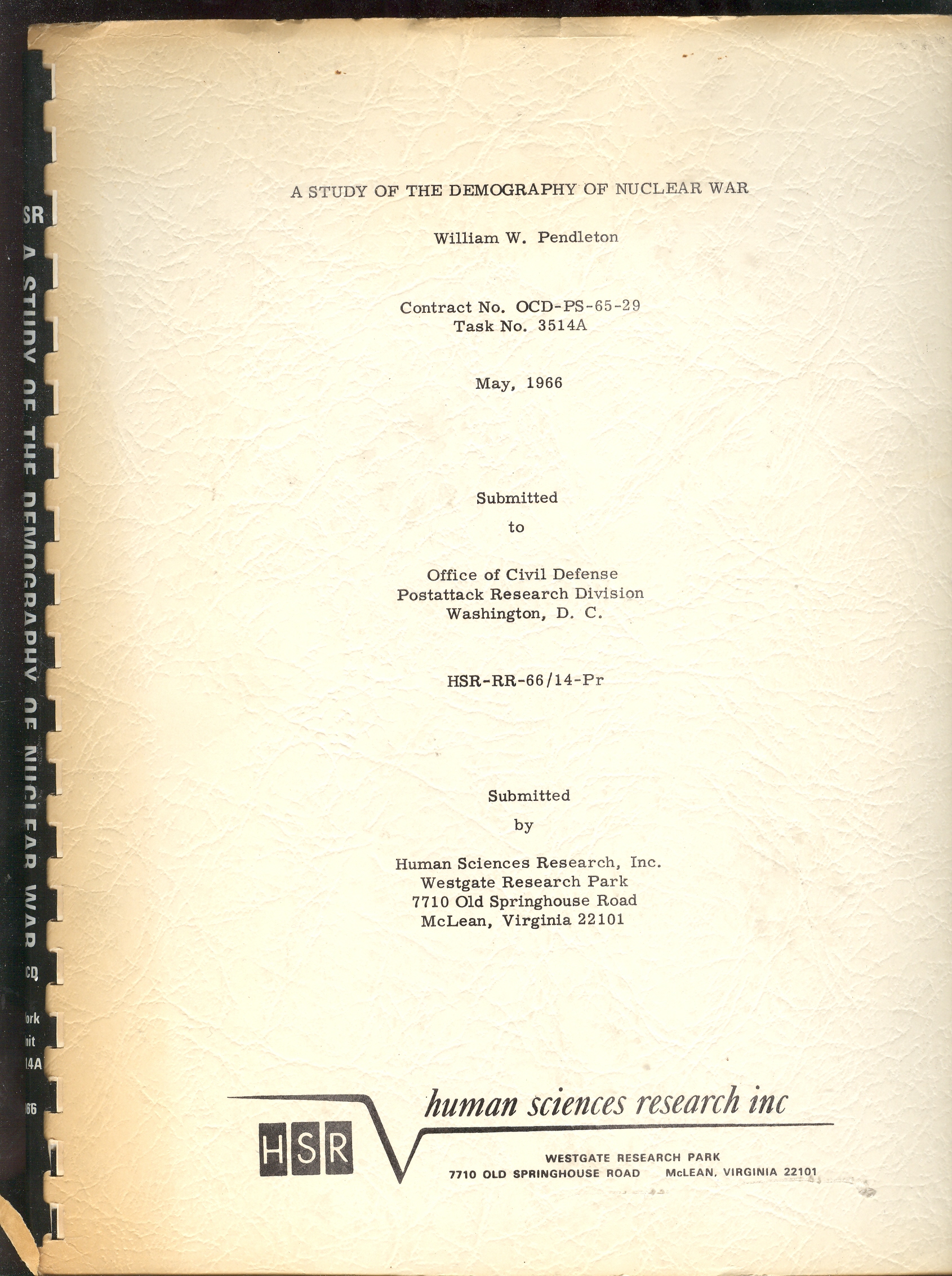 One such bit, plucked from this pile is William W. Pendleton’s A Study of the Demography of Nuclear War produced by “Human Sciences Research, Inc.” [This item is available for purchase from our blog bookstore.] Outside of its statistical foray in survivability and the procreative prospects of the left-overs of vast nuclear exchanges, the work is a solemn attempt at institutionalizing the death requirements of nuclear combat.The necessity of overwhelming carnage is presented in ironic and underwhelming language, the first bits of which are seen in the conclusion of pamphlet’s abstract1: