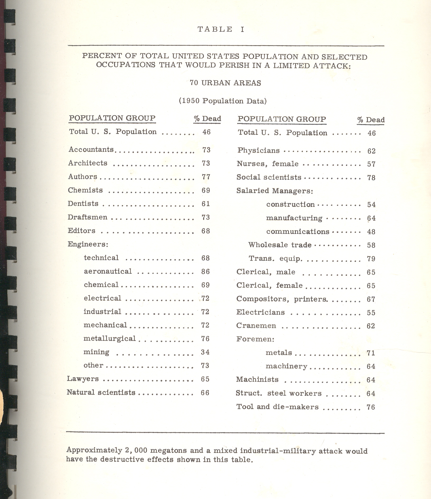 Back to the pamphlet and the interesting table that attracted my attention.According to one study [and for the sake of brevity I’m not going to describe the scenarios or data estimation methods and so on] the U.S. would suffer 46% casualties [meaning immediate deaths and not as a result of radiation or illness or starvation or the encyclopedia of whatever that would lead to death somewhere down the road].The resulting demographic of the “perished” by job description postulates that the most-killed category of worker would be: (#1) aeronautical engineers, 86% dead; (#2) transportation equipment salaried manager, with 79% killed; (#3), social scientists, with 78% of them going down with their clients; (#4), authors, with 76% gone.