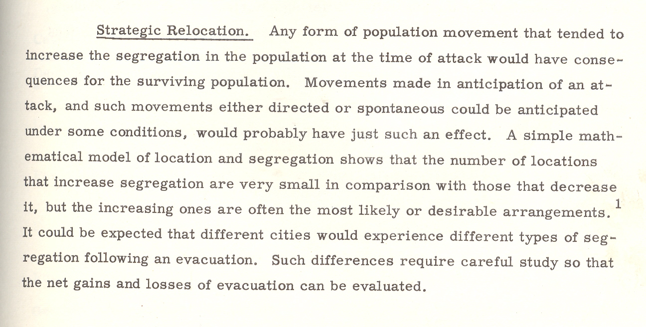 1. The abstract from the above paper: “The basic problem with which this report is concerned is that of determining the kinds of demographic change that might result from a range of nuclear attacks, ascertaining the effects of those changes on the future of the surviving populations, and indicating possible areas for Civil Defense action and planning. Earlier studies of the demography of nuclear war were examined and their relevant conclusions and methodology incorporated in the report. A different methodology--expected to be more sensitive to compositional effects--was then designed. The new methodology was tested and found to be more effective than the old. Surviving populations representing a wide range of variation in attack conditions were created on the basis of both old and new methodologies, and the demographic significance of these populations was examined. Assuming a range of post-attack demographic conditions, a series of projections was made on the surviving populations. The demographic significance of the recovering populations was then examined. On the basis of the analysis a series of recommendations relevant to Civil Defense planning was made: Within the framework of this analysis the crucial variable is the demographic pattern of the city. Changes in composition, as well as size, could be of substantial magnitude and would last for generations in some cases. Cities differ in the kinds and magnitudes of change to which they might be subjected. Considerable variation in the demography of surviving populations can be expected; that variation would be related to policy decisions; and those decisions should therefore be examined for their demographic implications.”