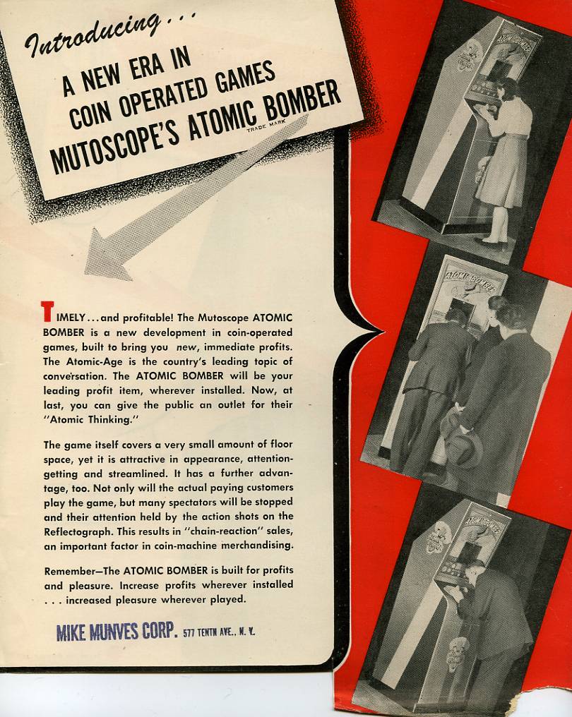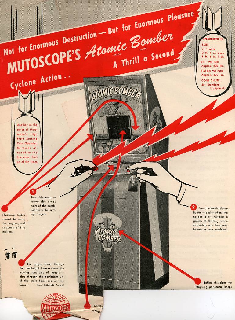 Perhaps the most fantastic of the atomic toys was this 1946 "Atomic Bomber" arcade game by Mutoscope--"not for enormous destruction--but for enormous pleasure":
