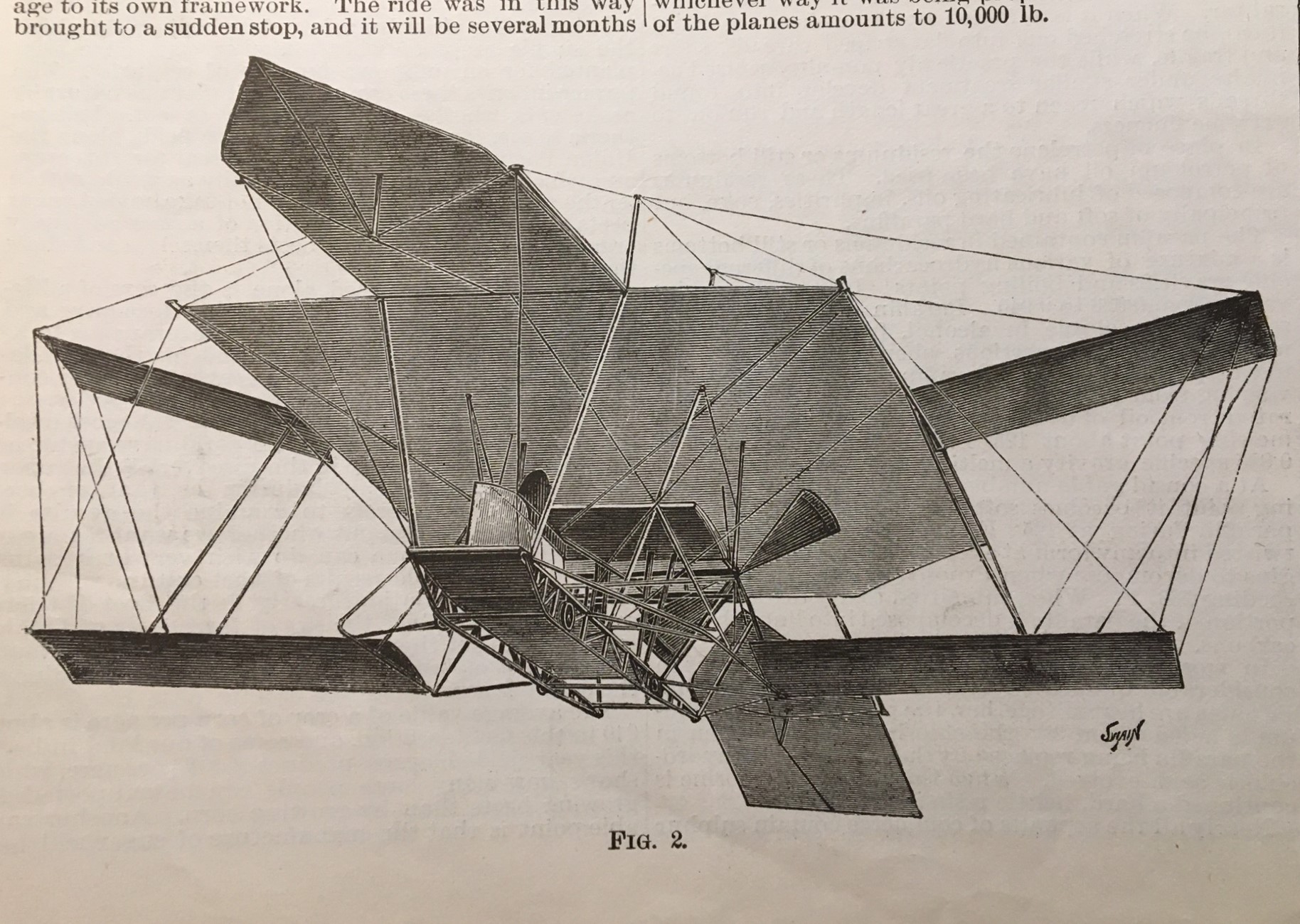 Victor Tatin’s ornithopter of 1875 actually was a much more sound “read” than it looked. He had a very advanced idea of the mechanics of flight, understanding the conditions, and physics, and the resistance of the air, and so on, but just couldn’t translate this understanding into a realistic design. This is especially true when he hit upon one of the key ingredients to the Wright success—a good, powerful but very lightweight engine. This was pretty big news, though Tatin would up a suicide.