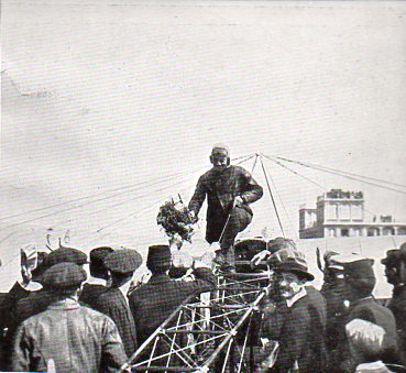 The aviator came again to earth absolutely self-possessed. When he alighted from the machine his first remark was “I wished I had gone another thousand feet up. Then I could have done it twice.”