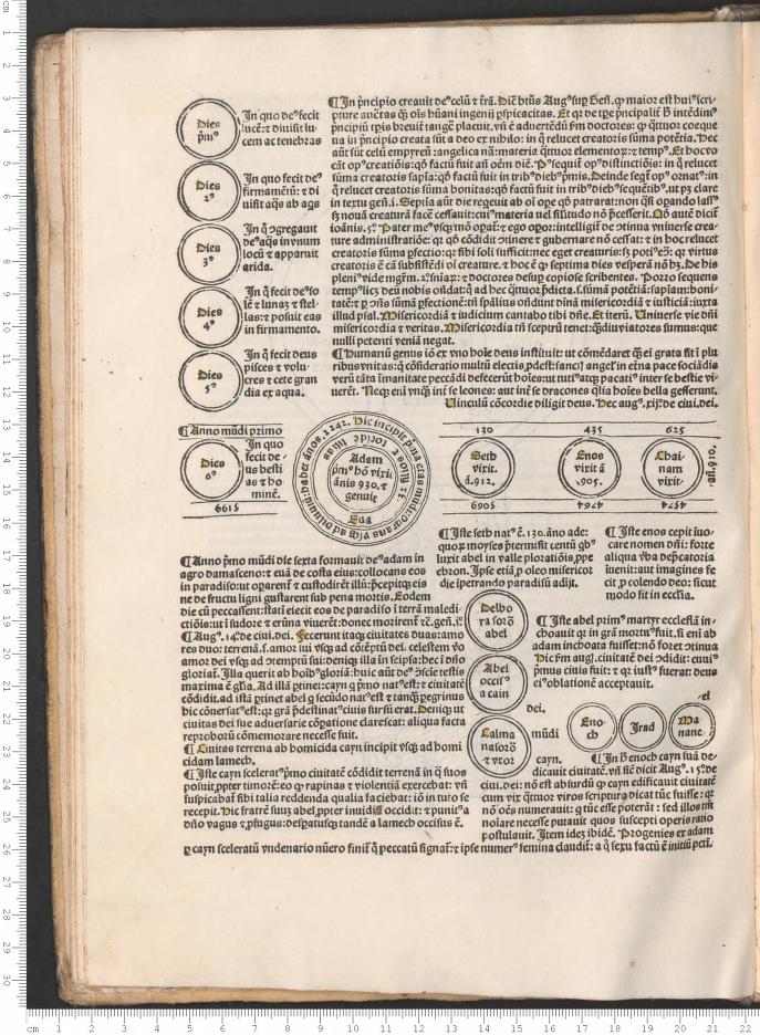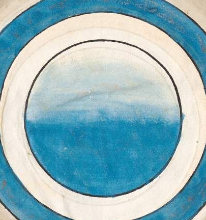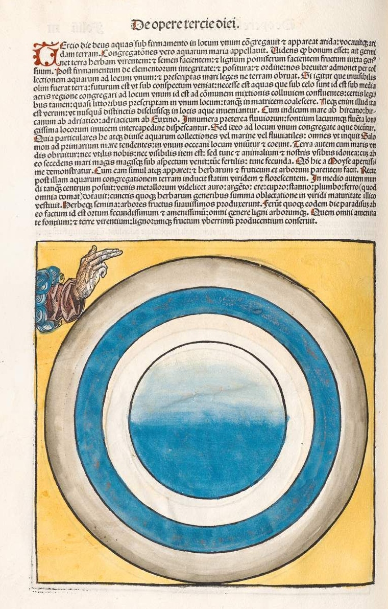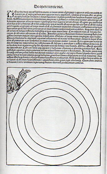 Perhaps I'm missing the larger picture, and that the circles/spheres are the things created, and that they are contained in the square surrounding them; and that the boundaries marked by the circular lines are not necessarily empty, and that it is the suggested of the circles that is the stuff created, placeholders, contained within the square of the creator's domain. Or maybe not. Perhaps the circles are signifiers for the elements--earth at the center, surrounded by water/air/fire. Perhaps the woodcut was just waiting for some color.