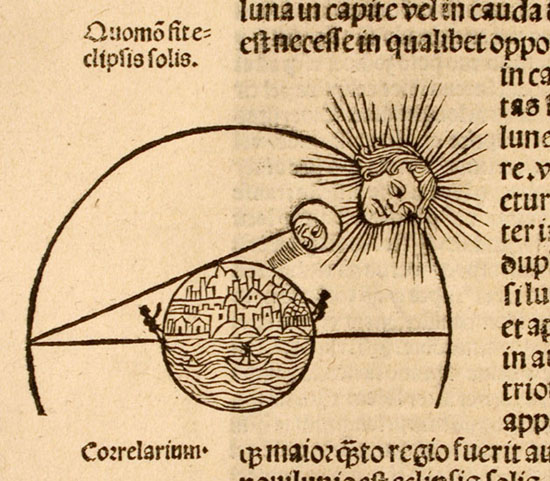Petri de aliaco ...[Paris, Guy Marchand for Jean Petit, February, 1498-99.] we find this beautiful illustration of a solar eclipse--finding again those curious stick-figure humans under a very Martin-Luther-like Sun: