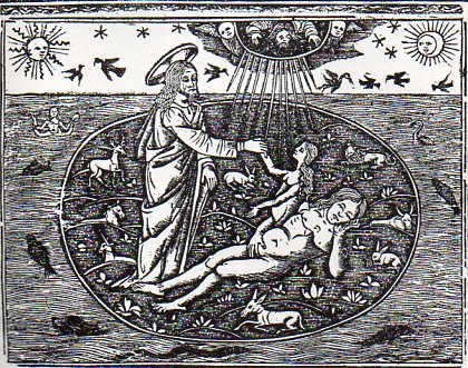 It is interesting that this image is a suggestion of the anatomical event, because Adam is shown whole and unmolested--I've seen many versions of this image showing Eve actually emerging from an opening in Adam's side, but the artist here is content enough with the suggestion of the bio-event.