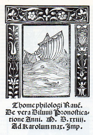 Of the many people who addressed this topic--including Machiavelli, Luther, Apian, Rabelais and Vives, among many others--was Tommaso Gianotti (Rangoni) (1497-1577), who gave his predictions this fantastic woodblock visual life in his work De vera diluvii prognostications (and printed in 1522). It was 16 pages long, and was one of many such slim pamphlets--his, though, did have this marvelous illustration. I think the blank sky helps set the sunken world and the collapsing boat of mankind into stark contrast on what lay ahead. (Gianotti led a long and distinguished career teaching logic (Padua) and astronomy (under the direction of Pope Leo X) as well as astrology (Bologna), and managed to outlive his many dire predicitons by half a century.)