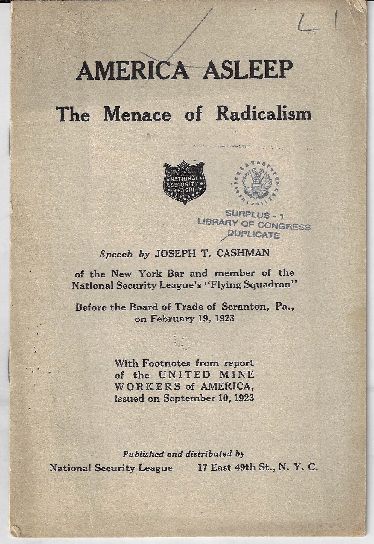 The “radicalism” that was a menace to America outlined in this slim pamphlet by the attorney Joseph T. Cashman (died in 1936 at 59) launched into the public consciousness in Scranton, Pa., in 1923, was Communism. Communism came in many flavors, and the author, as a member of the National Security League1, outlined some of them finding Commies in the United Mine Workers and the American Civil Liberties Union, to name two. The UMW was taking orders from the Third Internationale, which was also on its way to take over other trade unions. Then there was the larger issue of national security that was the base concern of the National Security League, which evidently went a little overboard with their issues, at one point in 1918 accusing the entire state of Wisconsin of treason.