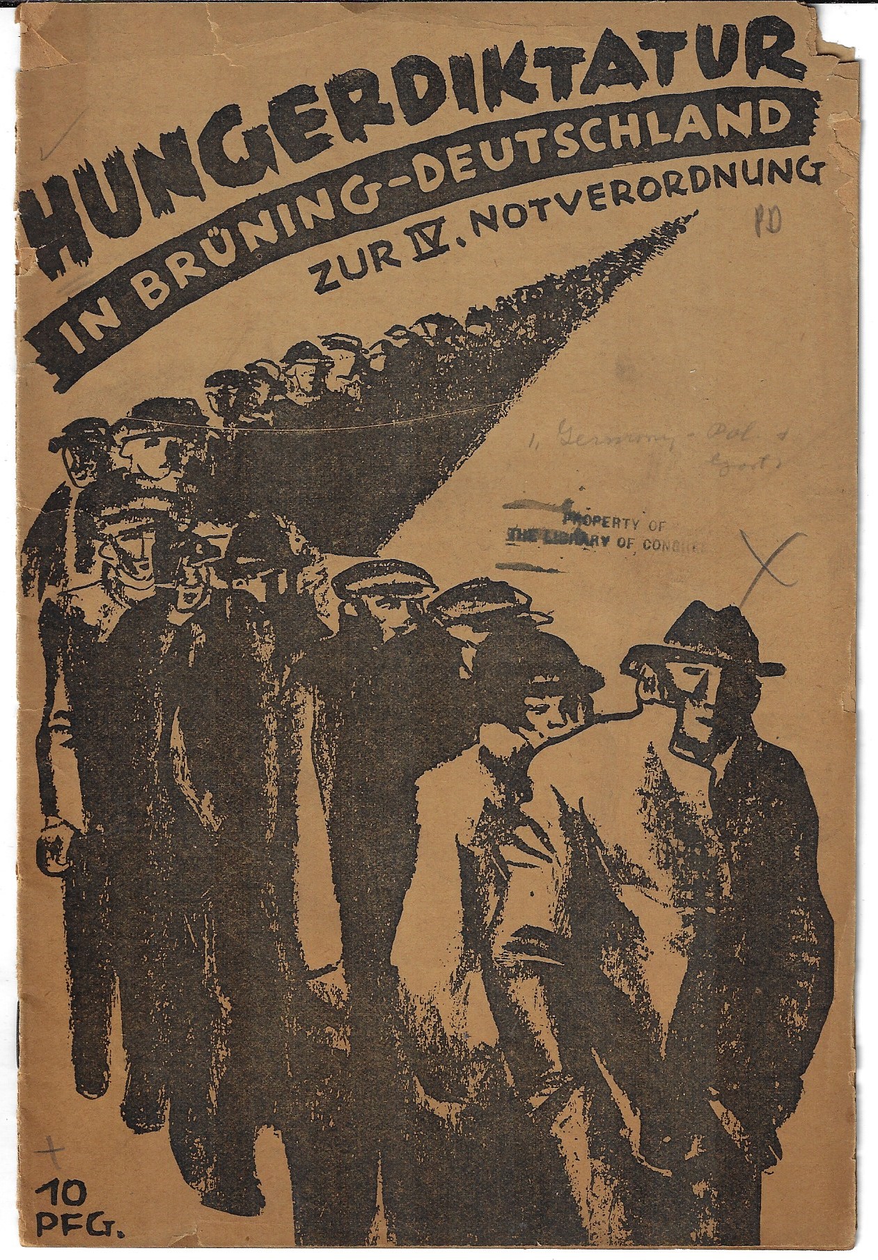 From what I can tell this pamphlet--Hungerdiktatur im Brüning-Deutschland zur IV. Notverordnung. Zk. Der KPD. 1931-- is an indictment of the responses of German Chancellor Heinrich AME Bruning to the explosive Depression in Germany beginning in 1930. Bruning became Chancellor right at the outset of the Depression in 1930 and his options were already very limited, economically speaking, without the failure of the world economy adding to an already deeply compromised situation. Nevertheless, his policies are seen in different perspectives, and he was out of office by 1932 and fled Hitlerism and Germany altogether in 1934. (Bruning was two chancellors removed from Adolf Hitler taking the position in 1933.) In any event the pamphlet here leaves no doubt about the impossibility of the social situation in Germany in 1931 and places a long legion of the Hungry at the feet of Bruning's Germany.
