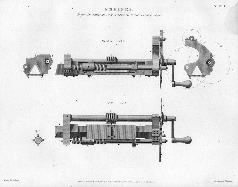 And then there was the "Engine for cutting the Screw of Ramsden's Straight Line Dividing Engine", which is an absolutely gorgeous piece of drawing. A person could crawl all over this image in varying degrees of microscopic inspection and find all sorts of beautiful internal images, a large example appears here: