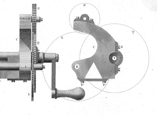 What it really refers to here is a precision tool that whose effects were extremely wide felt but about which we don't really hear about today. This is the dividing engine of Jesse Ramsden,and Englishman who invented a circular instrument that would incise precise values on precision instruments like surveying compasses, delineate the linear and circular scales of measuring instruments used in astronomy and navigation, Before Ramsden, the engraved marks on instruments would have been made by each individual manufacturer, each of those depending on marks that they made in the past, generations of such things in a line, over and over, a quite individualized effort, necessarily dependent upon the precision of each manufacturer. In 1777 Ramsden produced an instrument1 of exception precision that was correct and fine and dependable2. [The image above was found in Abraham Rees' monumental Encyclopedic Dictionary..., and is entitled "Engine for cutting the screw of Ramsden's Circular Dividing Engine" and was published in 1814. Below is a detail of the plan for the winding of the gear works. In order for his machine to work at such a high degree of accuracy the component parts must also have been of a very high calibre--to that end Ramsden developed what is essentially the modern screw cutting lathe from which he manufactured the gear works for his Straight and Circular Dividing Engines.3]