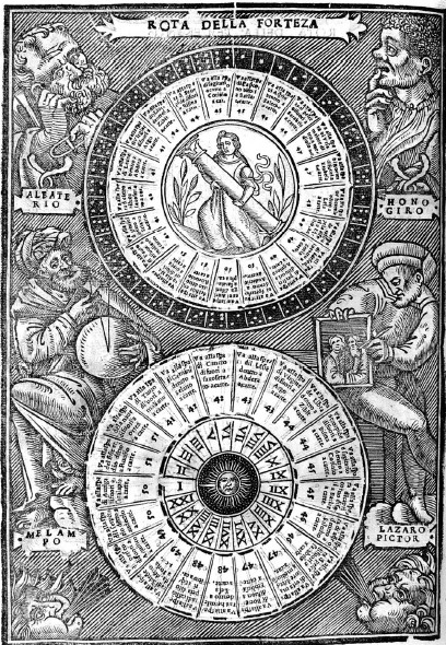 In Sigismondo Fanti’s Triompho di Fortuna (Triumph of Fortune), printed in Venice in 1526, the second illustrated fortune-telling book to appear in print. Fanti's book, like Spirito’s, functions as a game in which the seeker follows cues that lead from figures of Fortune to houses and then to wheels, spheres, and astrologers, the path determined by either a throw of the dice or the time of day at which the book is consulted.