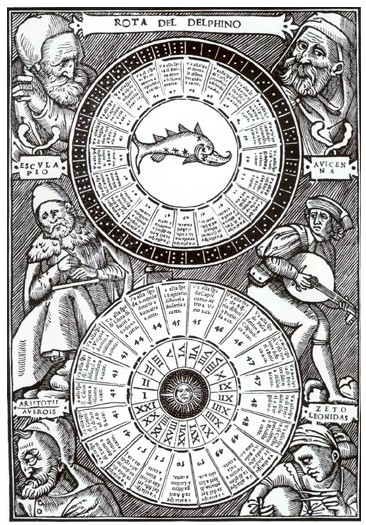 In Le Passetemps de la Fortune des dez, written by Lorenzo Spirito in the late 15th century1 and published in this pictured format in 1559--a delightful little book with many2 zodical illustrations and the first printed illustrated book on fortune-telling—appears this gorgeous wheel of fortune wood engraving.