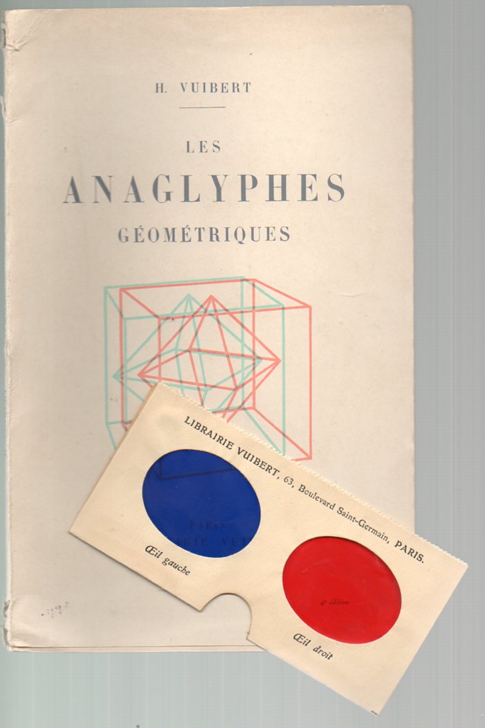 Vuibert's book is a very early example of the use of the anaglyphe--examples of the use of the method go back to the 1850's, when d'Almeida used a version of the idea to punctuate lectures using a magic lantern; the (printing) process of the anaglyphe wasn't patented until the 1890's by L.D. DuHaron. It does confuse me or remind me quite a bit of Oliver Byrne's beautiful monster The First Six Books of Euclid in which coloured diagrams and symbols are used instead of letters for the greater ease of readers... printed at the Chiswick Press by C. Whittingham for William Pickering in 1847. The book is, well, unusual and probably not at all usefu11. Bryne replaced all of the algebraic notation, identifying letters and almost all of the descriptive text with color and color codes, leaving Euclid mysterious, hidden, awkward, impervious, and, yes, beautiful2. As a matter of opinion this work presages the cubists (and especially Piet Mondrian) by 60 years, and all by accident artwork.