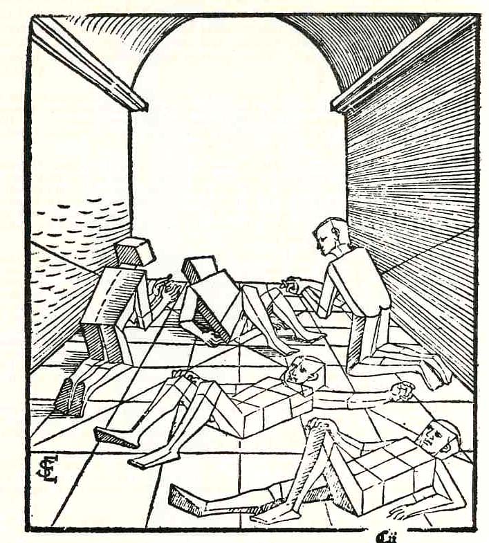 In another, much earlier case of removing detail and adding abstraction for the sake of simplicity in representing an idea, Erhard Schoen, in his Unnderweissung der proportzion und stellung der posssen liegent und dtehent, printed in Nurenberg in 1538, presented these cubed figures (below). He used simplified geometric form to stand in for the curvy humans, replacing them with proportional stacks of boxes which would more easily explain to the younger reader how to represent the human body in space and in proportion to other things.