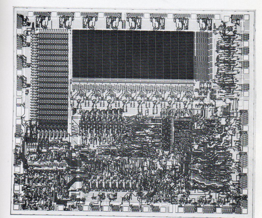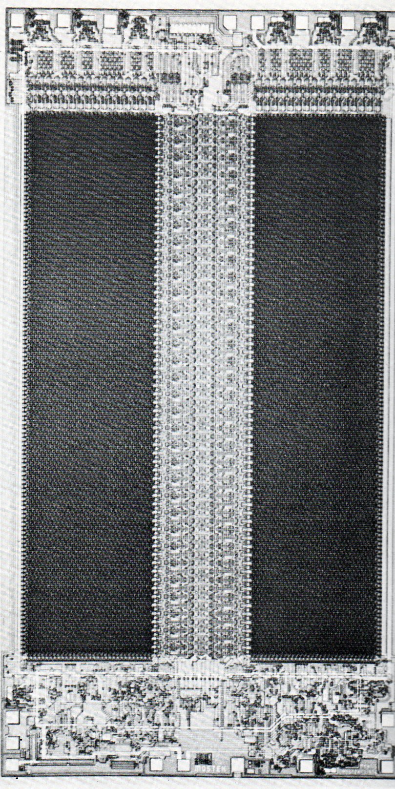 I can easily see the similarities in Fontana's work and that of Intel. Here, in a photograph of the 16k bit random access memory chip (via Mostek Corporation) I can see a vast palace at the top of the picture, with a long, columned entrance with manicured gardens on either side. The image offers an elevation and a plan--that is, the top and bottom images of the buildings are seen in a deeply oblique view, while the central part of the image is a straight-out plan. At least that's what I see, its imaginative possibilities more appealing than the physical realities (though that's where the extraordinary value is/was).