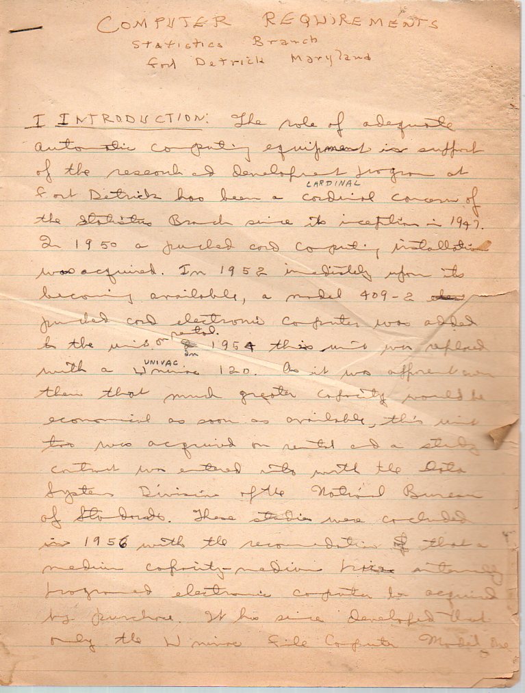 The document ("Computer Requirements/Statistics Branch/Fort Detrick Maryland") is handwritten by the former chief statistician around 1957, and in five tight pages outlines the basic necessities for the needs of computing facilities at the fort. The document mentions two machines in particular, the "409-2" (with is the Remington Rand 409-2, an ENIAC style machine, produced in 1952) and the UNIVAC 120 (which is a release of the 409-2, done in 1953).