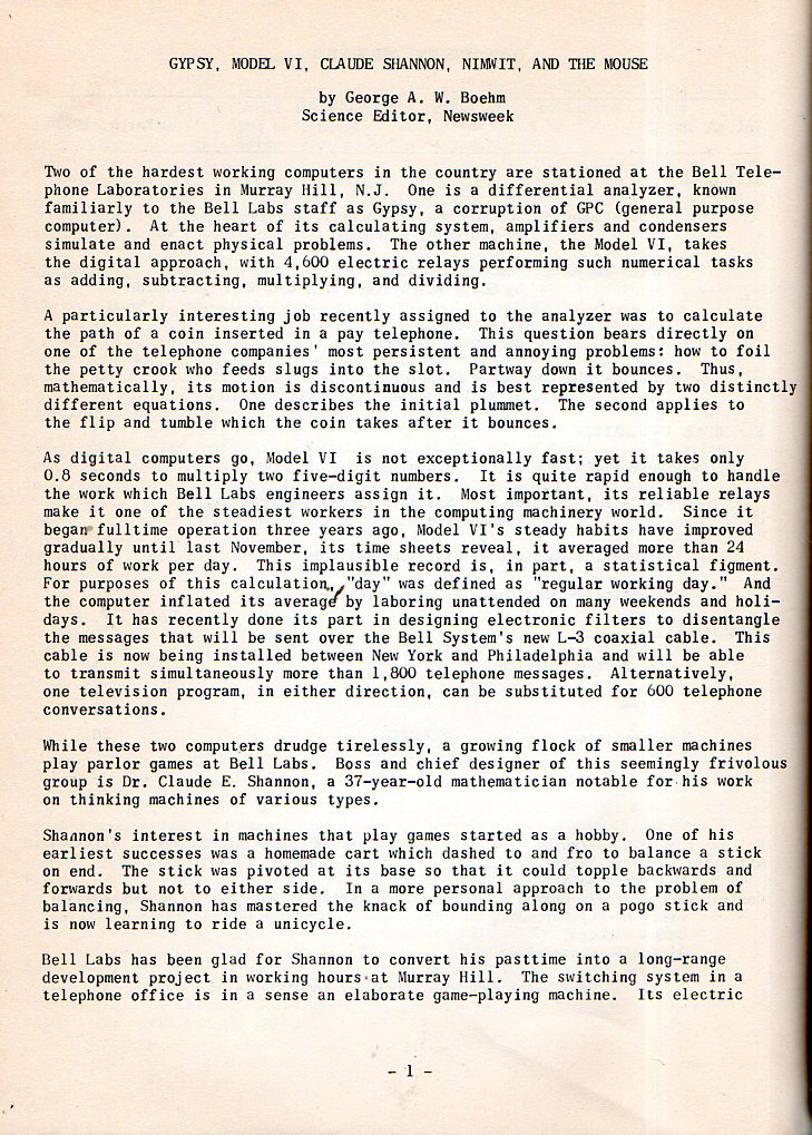 George Boehm wrote a fine, semi-offhanded paper on Claude Shannon's inventiveness: "Gypsy, Model VI, Claude Shannon, Nimwit, and the Mouse", in Computers and Automation, volume 2, number 2, March 1953. (The article is found on pp 1-4 in the issue of 37pp.)