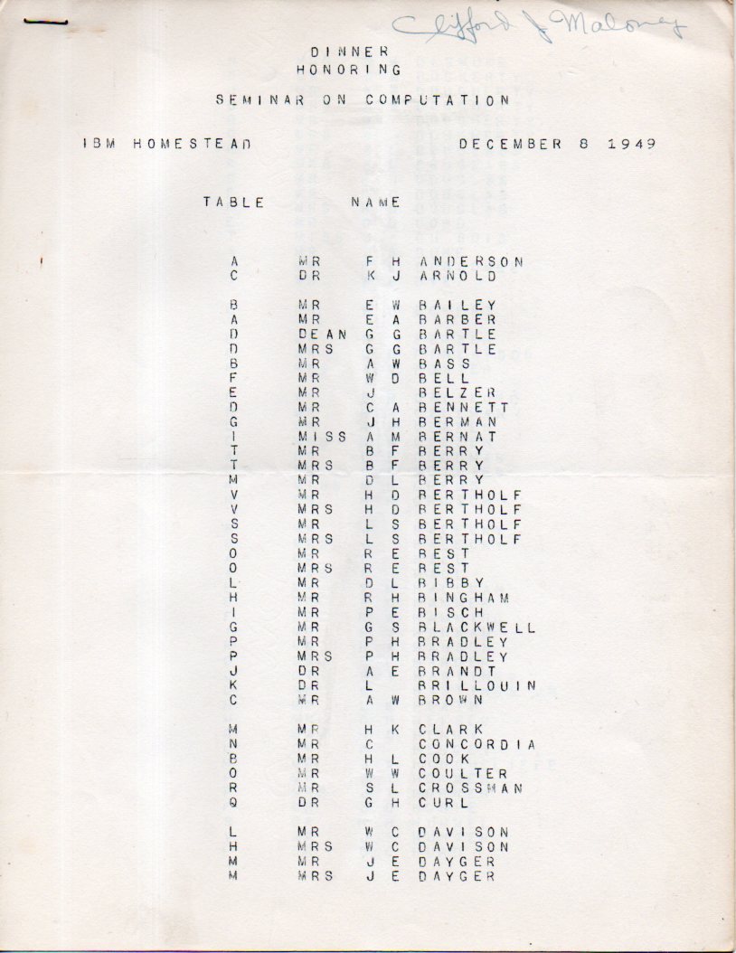 First up is this computer-printed list of attendees for "Dinner Honoring Seminar on Computation, IBM Homestead, December 8, 1949. It is a hand-stapled, four-page list with some big names in the history of computing including Brillouin, Eckert, Grosch, Hamming, Tukey, Yowell, and others.