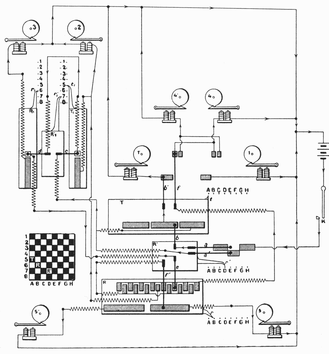 His superb creation, which he called "El Ajedrecista"7 ("the Chess Player") was an electromechanical device which pitted an endgame between a King/King-rook, and was fully and completely hand's-free functional. A later version attempted an improvement on this magnificent machine using magnets.