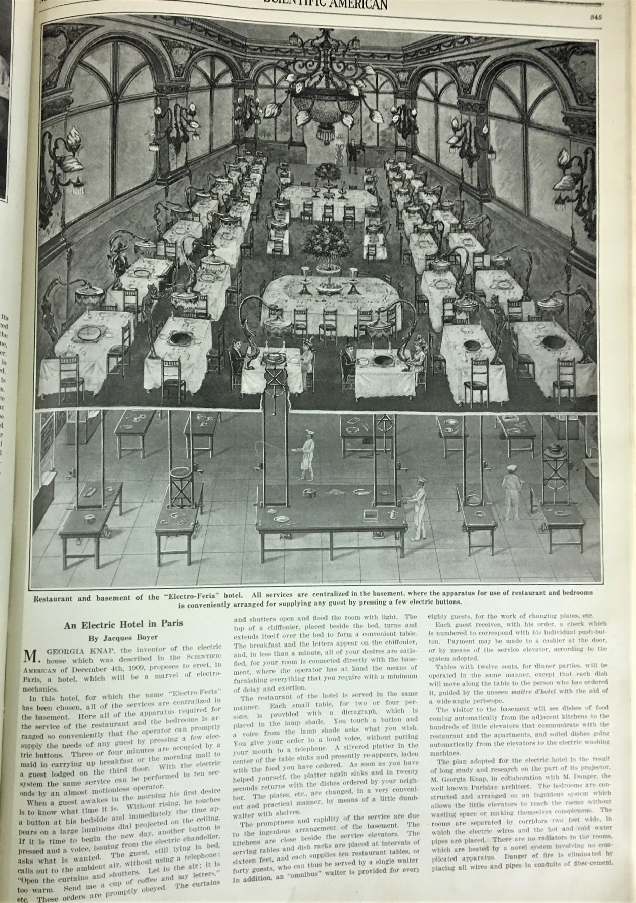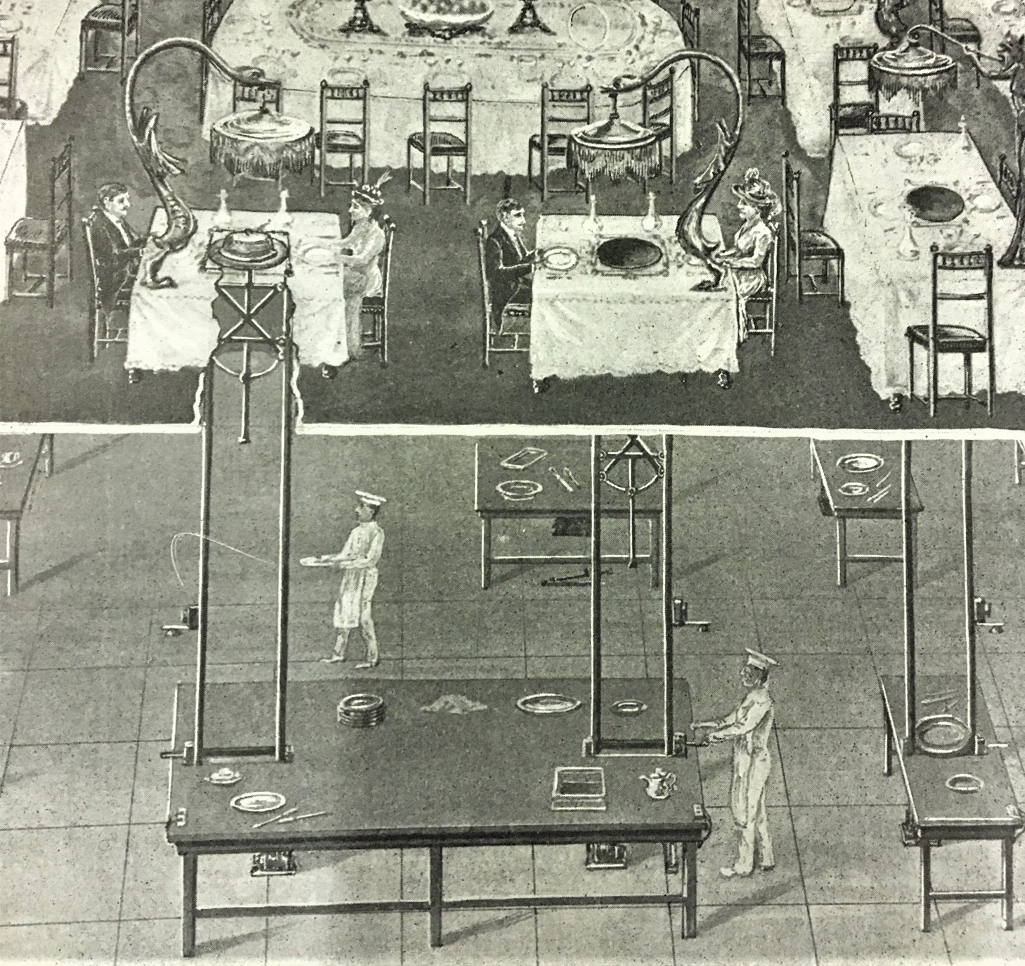 And of course we have the electric dining room, which is the subject of the illustration for the short article. You can see clearly in the detail that all of the service is taking place in the basement of the hotel, with each table having a tiered dumbwaiter that connects it the the kitchens down below. The diner speaks their wants, and the stuff appears, plate after plate. Evidently there is one waitstaff member per tables, though who knows how many people are wailing away at the varied kitchens in the basement.