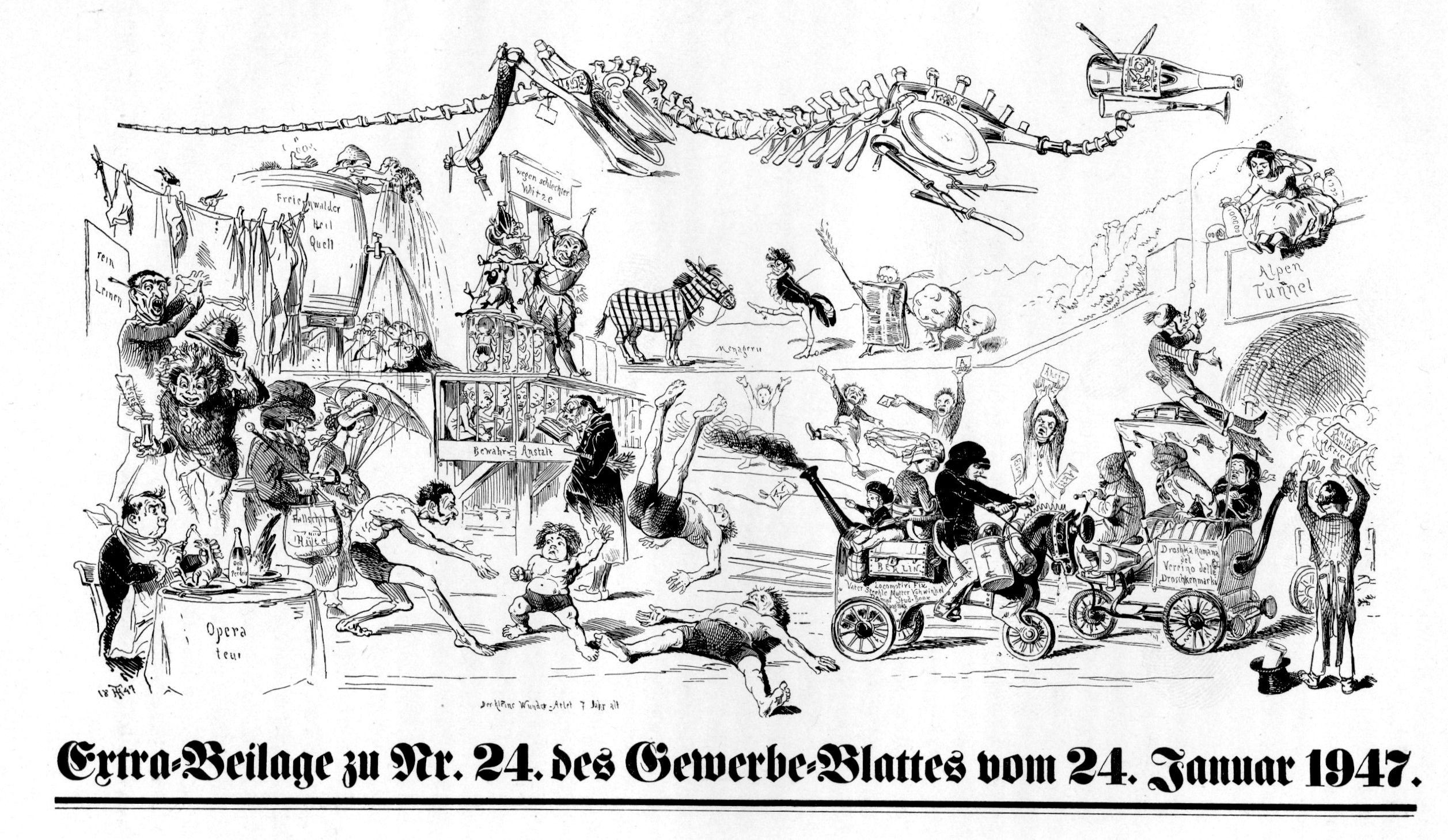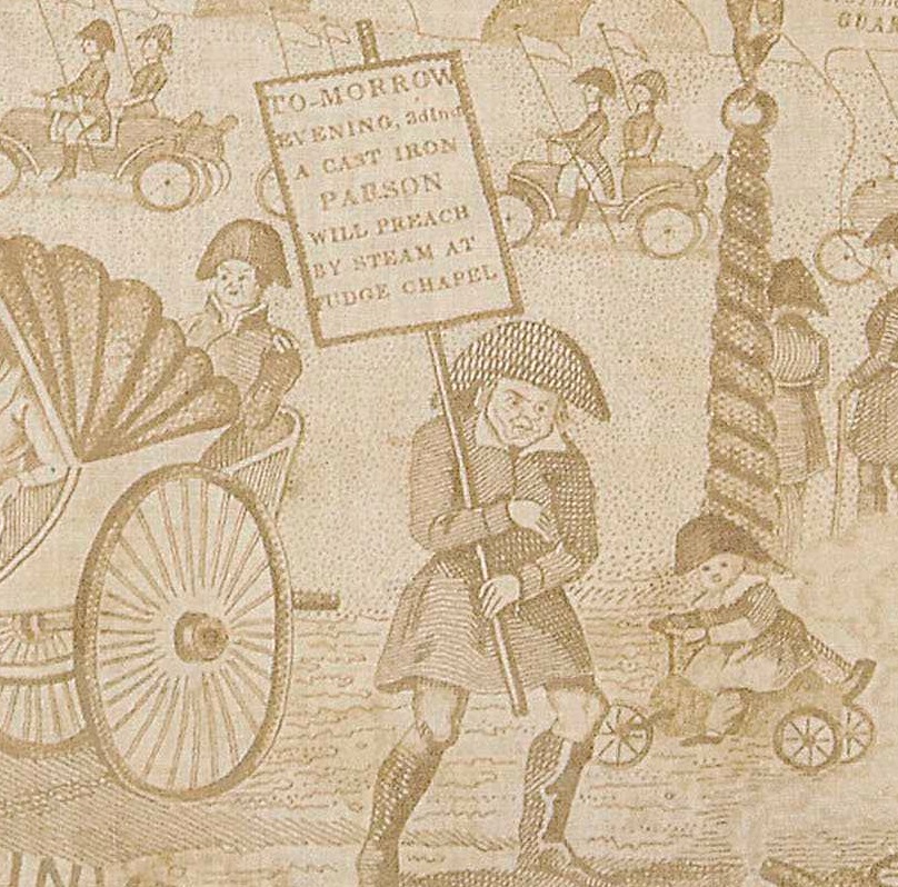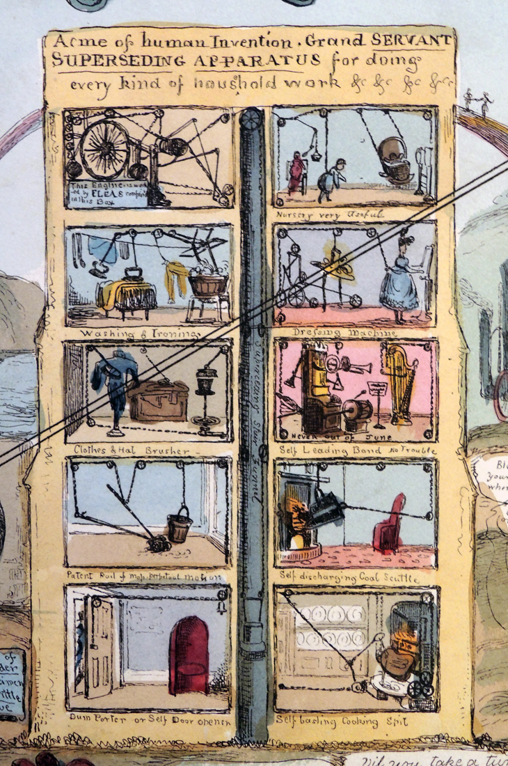 At the bottom of the print is the prize, a very unusual placard concerning robotics: "a cast iron Parson will preach by steam at Fudge Church.” This is doubly intriguing because it not only invokes a steam-powered person—still fairly rare in the literature in the first third of the 19th century—but also a thinking one, a parson, a mechanical object trusted with the preaching and interpretation of a basic human belief system. This seems a bit on the primitive side in its display, but the intellectual imagery is pretty powerful stuff. I assume that the power of this would've been less so at the time of publication, guessing that Grant was making more of a not-so-subtle satire on the steam-driven puffery of some preachers with the creativity of kettles, and that in the future this would be magnified to the point of steam and smoke. But still the idea of placing the deeply emotional stuff of belief systems in the control of a machine is extraordinary for the time.