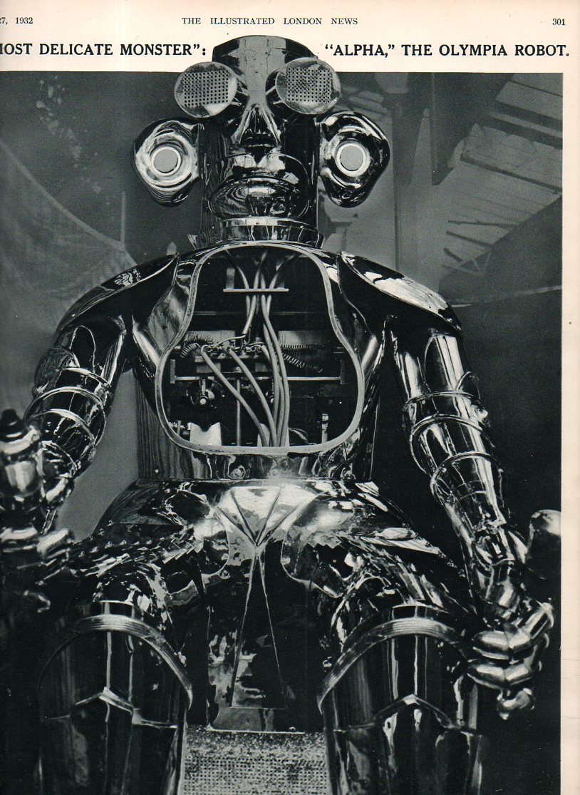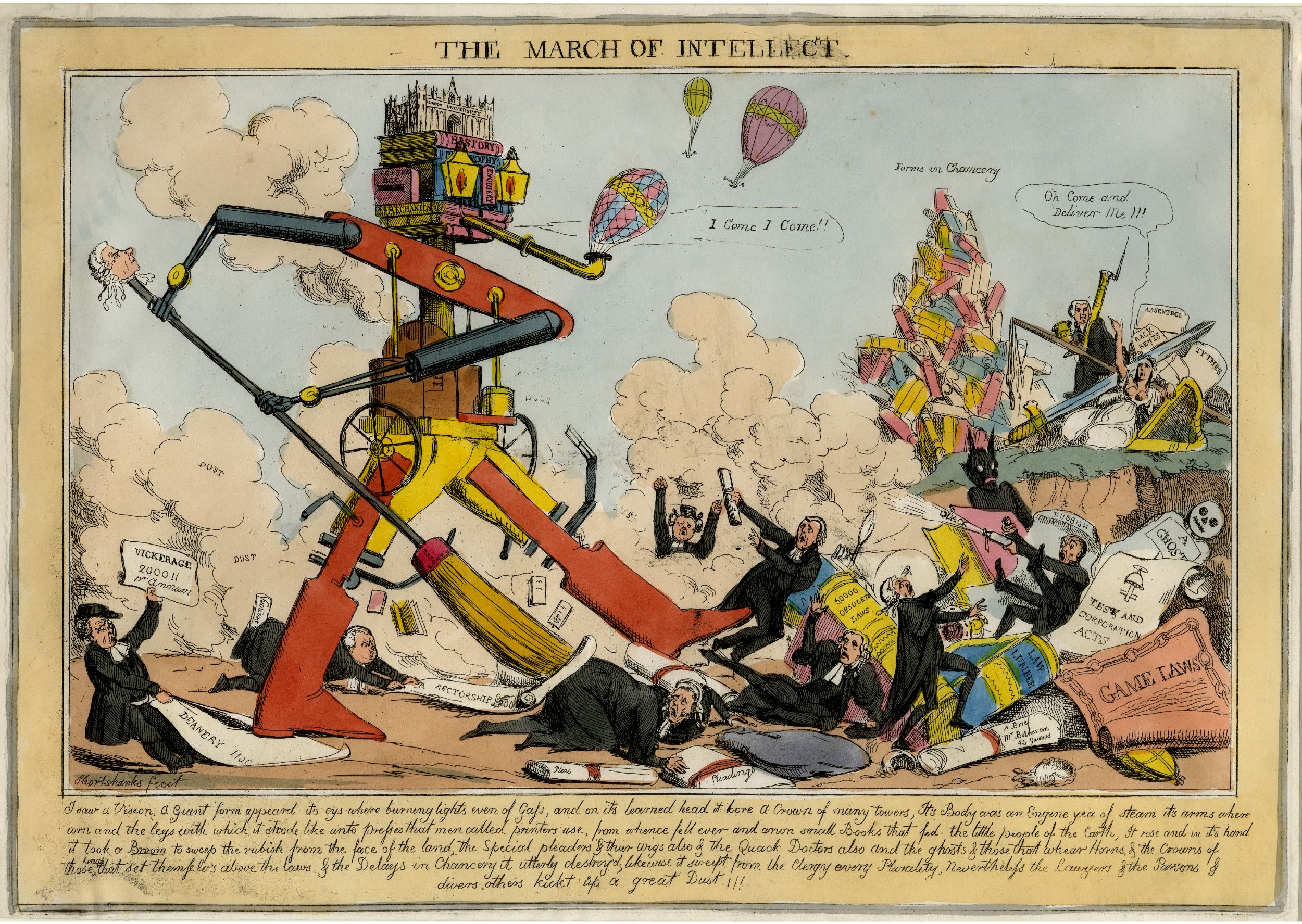 A few years earlier William Heath's March of the Intellect series (1825-1829) displayed another robotic entity witha book-driven intellect in its “crown of many towers” (London University) that swept up the great "rubbish" and "dust" of society. The robot was thinking in its way, distilling the promise of data and intelligence in its book-laden head, firing its set of gas-light eyes, iron arms, and legs made of printer's tools, sweeping away useless and insulting lawyers and jurists and their legal wigs and obsolete and repetitive rules, medical quacks, and the dust of other official abuses, "sweeping rubbish from the land.” It was making decisions and acting on them, trumping the humans in its path.