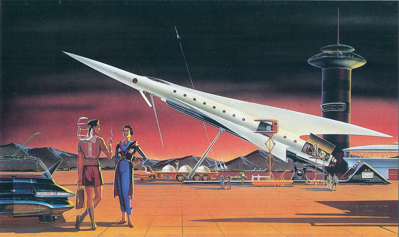 How do we sort thousands of people writing about hundreds of thousands of future sightings in human development? Flying cars and people and cities and retrievable/liveable subconscious bits and dream, atomic blast guns, two-way wrist tv/radios, perfect places of nothing but intellect and floating intelligence, horseless cities, Soylent Green, personal computers small enough to fit into the trunk of your car, Edison's anti-grav underwear, buffalo herding from nuclear-powered sports cars, Maginot Line-sized mobile tank-ships, rockets to the Moon, rockets to the Sun, and rockets to tomorrow and to yesterday. We have futures where Manhattan is completely covered by thirty-story skyscrapers by the social warrior Thomas Nast; where George Holmes kills off cities with airplane-filled suburbs in 1912; where electric titan tank monsters with canons instead of cigarettes crushed hopeless opponents in 1918; where atomic-powered dirigible airports free up land in 1946; where a floating NYC is moored above the hole-in-the-ground where it once stood. Where spacecraft of mega-sharp ultra-fins await their cigarette-smoking pilots in 1953 and out-Eiffeled mile-high vertical airport towers, and where an identical duplicate Earth floats serenely in place above a bird's-eye view of Manhattan.