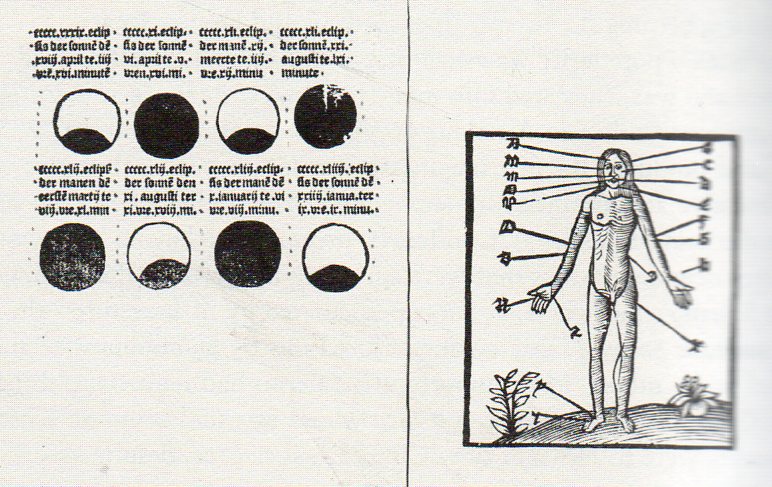A less-necessary but much larger dot that filled in the spaces of medical service to humanity is found in Der scaepherder Kalengier (“The Shepherd’s Calendar”), a beautifully-designed book printed in 1512. The book was an encyclopedic compendium of contemporary medicine, but it also contained s little less than that, having a section of zodiacal dots and semi-dots in relations to principal points on the body that could be used for bloodletting.