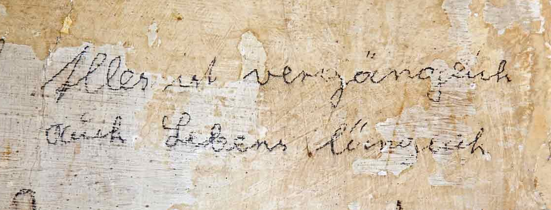 On the opposite side of the painting from the king, on the far right corner, is a pair of, what, friends or something singing and playing, completely oblivious to the larger scene and even to the lute-playing skeleton leering and hovering over them. To their left is particularly disturbing figure—a skeleton wearing a human face with no eyes is tipping over a brazer filled with flasks, this taking place next to an upset backgammon board and a fallen deck of cards.