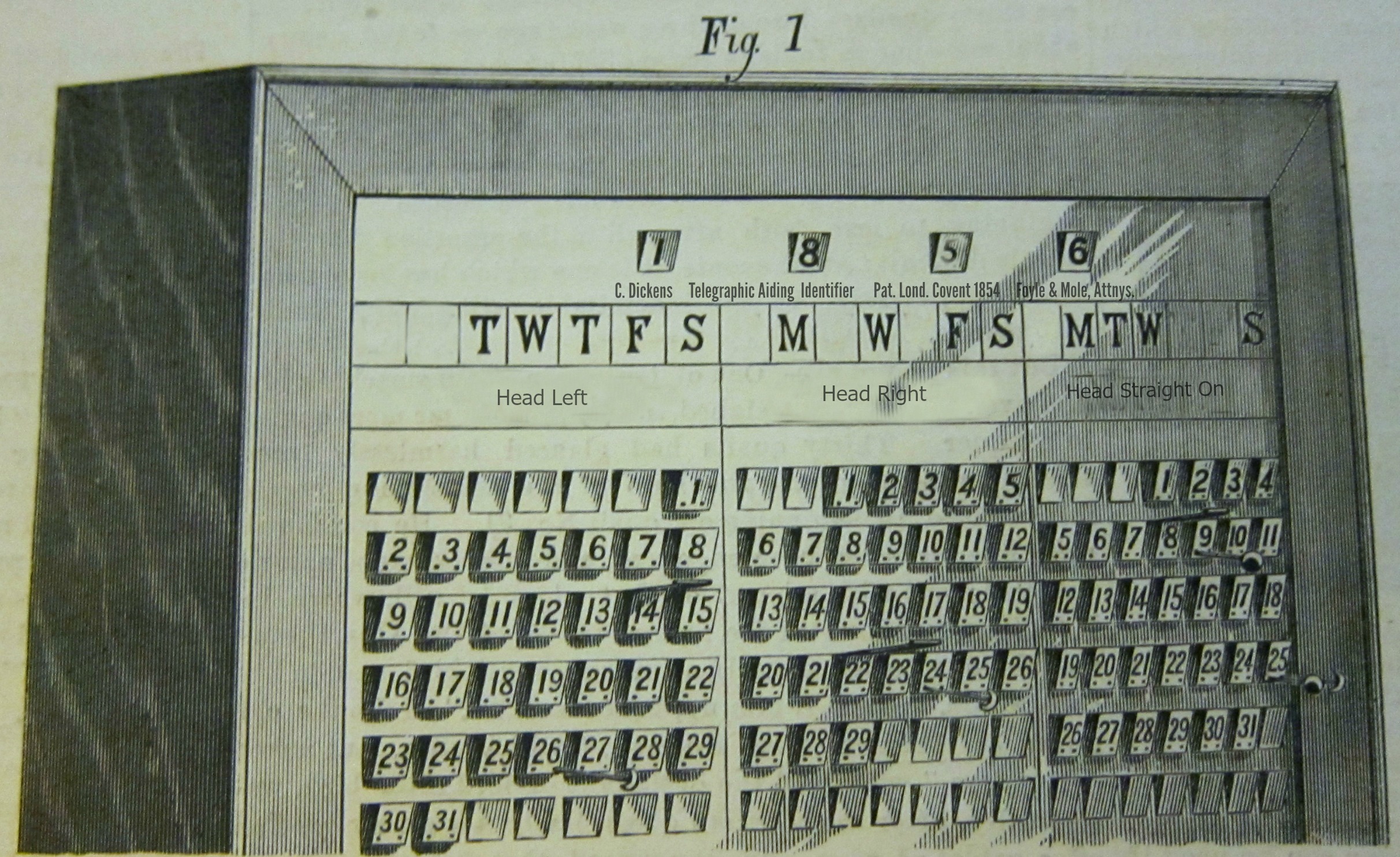 Dickens' interest in pursuing the pursuable, of criminals and crime and prisons and workhouses and so on, has been long established, a pursuit of his throughout the whole of his life. In addition to establishing a protocol for the investigation of crime, Dickens seems to be the first to recognize the great value of a standardized method of communicating the description of criminals from one jurisdiction to the next. Describing someone as short, bulging, ambiguous, with a harlot's son's nose and a twisted smile doesn't go very far in identifying someone unless you knew that there was one way of defining each one of those characteristics. Dickens created such an instrument in his Telegraphic Aiding Identifier, a device he would finally patent in 1854 with the aid of his attorneys Foyle & Mole (applied for at Coven Garden).