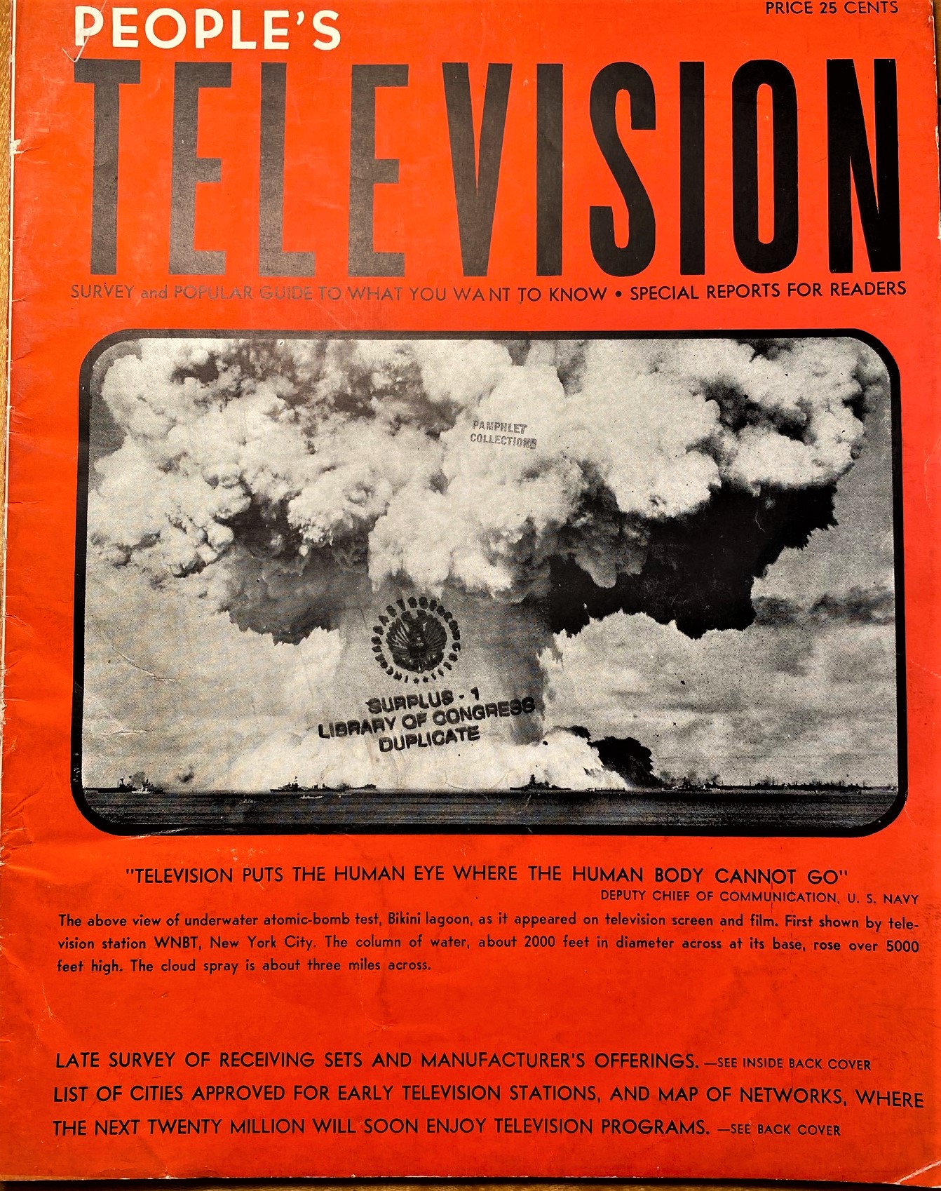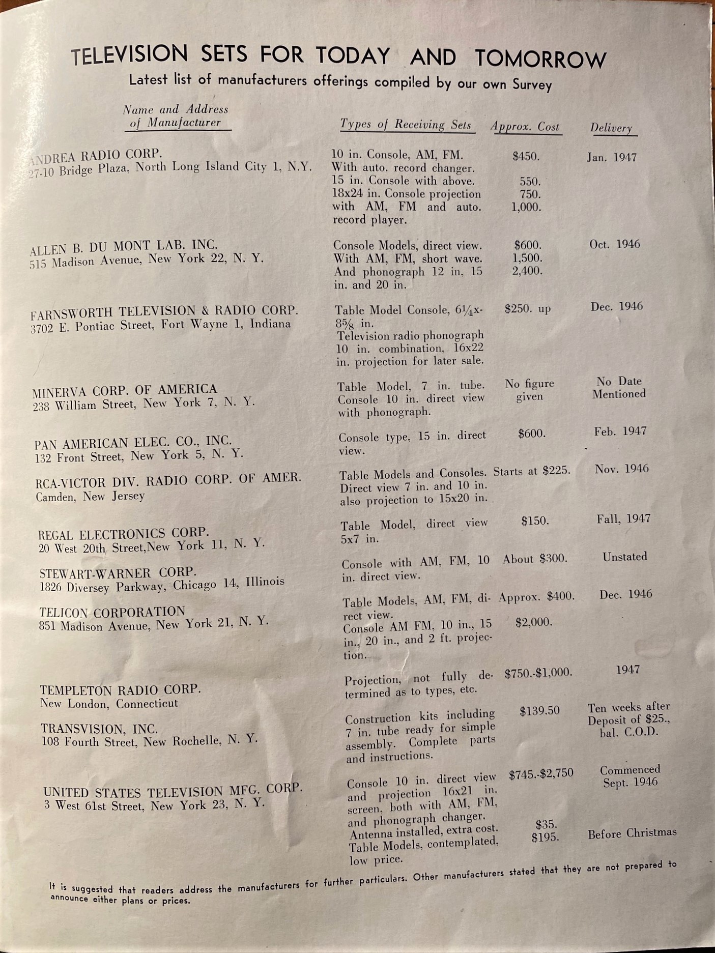 I was initially attracted to this oversized pamphlet for its A-Bomb cover--using this sort of imagery was a thing in advertising in the Cold War years...pervasive, even. It was not uncommon to see this sort of image used to sell bubble gum, kids' toys, motel rooms, laundry cleaners, and just about everything else (plus, of course, firecrackers). This pamphlet though was a bit different from the others, as I expected that given its contents it would've been published around 1950. Wrong! This work hit the streets in 1946, about a year after Hiroshima and Nagasaki, and very early on in the history of public television. Television (and facsimile transmission) exited around the edges of public awareness for a few decades, but television as a relatively common form of amusement with not-terrible accessibility was very new in 1946. So I wanted to share a few of the useful bits that I found in this short (24pp) and oversized pamphlet, the primary one being a survey of costs of television sets listed by manufacturer.