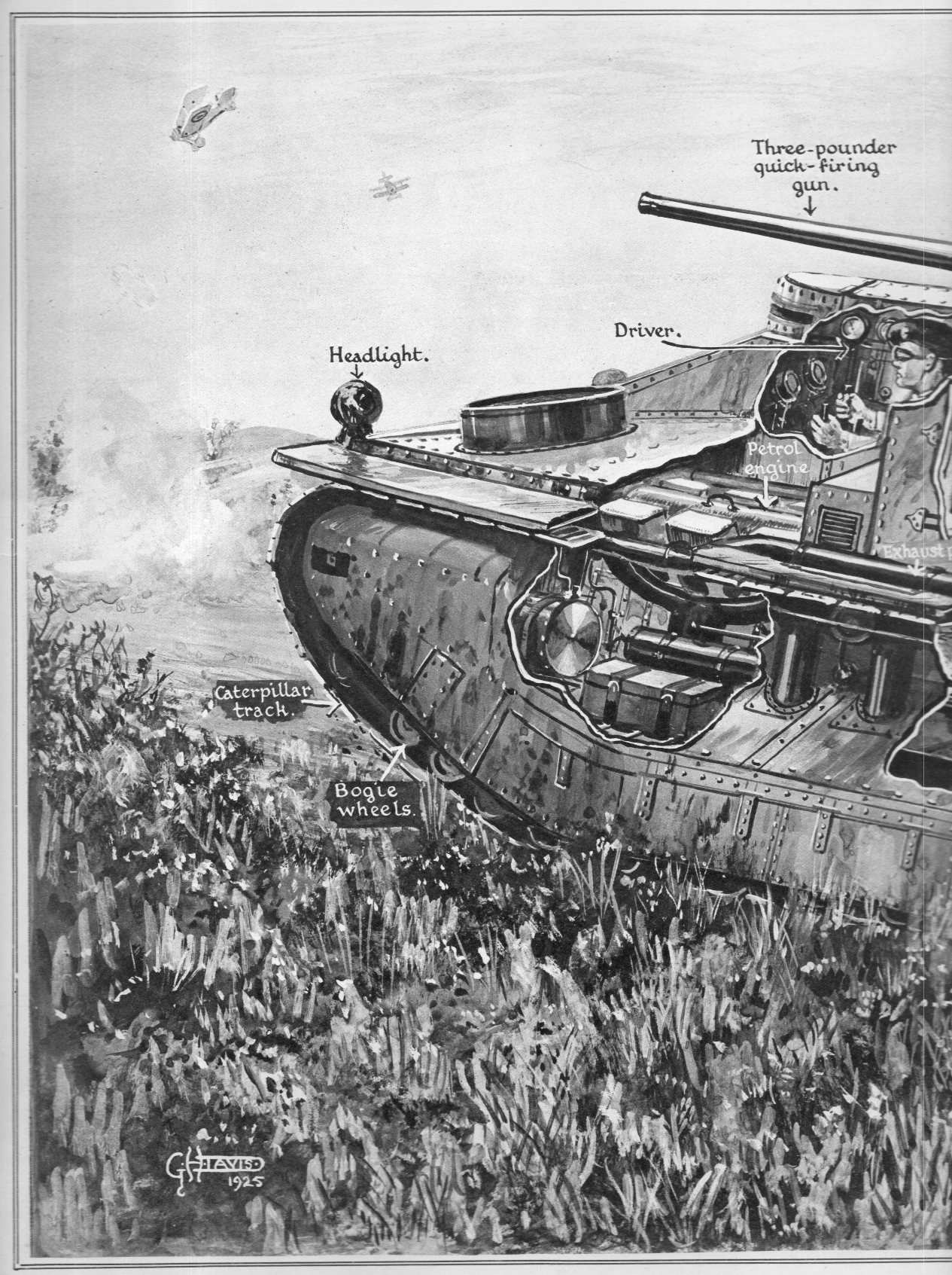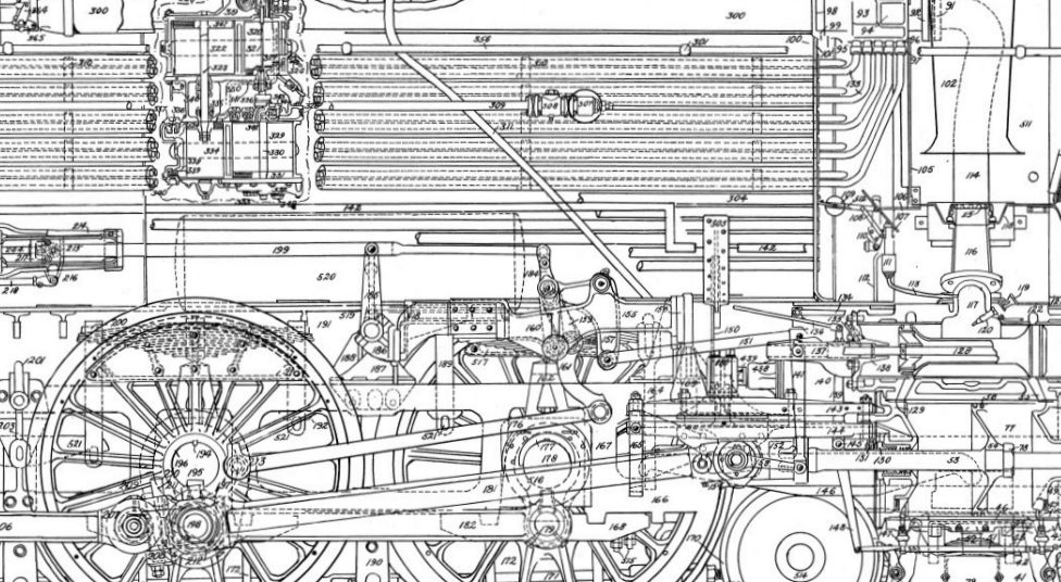 This photo reminded me of a very detailed, three foot long locomotive schematic that I have in the studio. It is a wonderful thing, and I've included some images of it below, all of which are clickable and very expandable (and clearer). Here's the first detail: