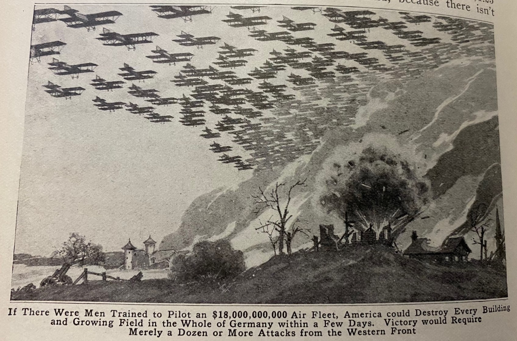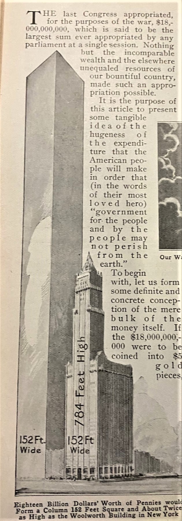 Here's a fine and somewhat misleading representation of the U.S. Congressional war allocation of 1918 for what was then the staggering figure of $18,000,000,000 (or about $387 billion in 2020 according to the BLS), found in the pages of Popular Mechanics for May 1918. To visualize the 18-billion, the editors displayed the amount in terms of something somewhat familiar to most readers. For example, if the appropriation could be laid directly and only into the manufacture of airplanes (and bombs I guess) the editors guessed that the force would lay waste to all of Germany in about two days. Guessing that each aircraft cost about $10,000 in 1918 that would mean there would be an attack force of 1.8 million planes. Granting each a capacity of 500 pounds carriage, their entire force could deliver about 20% of the total tonnage dropped on Germany by the US and UK during WWII for each 1.8 million plane sortie. (I'm guessing at some of the figures but I think that this is about correct.) Given that the "bomber plane" was still in its cradle, this could not have painted a very clear picture of what $18 billion dollars could buy. Further guessing here is that there were fewer than 50,000 aircraft in existence in 1918, so imaging the 1.8 million figure would have been staggering.