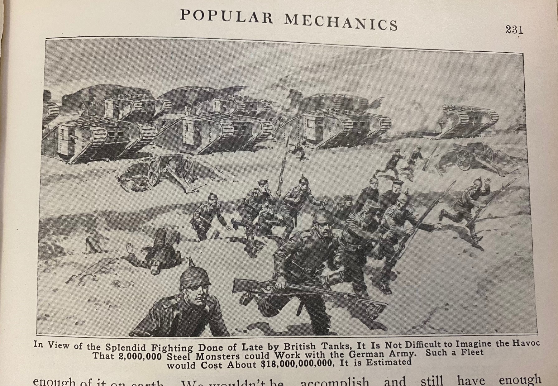 Another example from the same article involves envisioning $18,000,000,000 worth of tanks, which in 1918 would cover fielding 2,000,000 of them. This of course is an enormous number, particularly having in mind that about 50,000 U.S. Sherman tanks were constructed between 1942 and 1945, which is about 3.5% of the total talked about in the article, and the largest tank battle in history at Kursk in July and August 1943 involved about 6,000 tanks between German and Soviet forces. Given too that the tank is only a few years on the battlefield at this point there was really no way that a person could visualize 2 million tanks--I suppose no commander in 1945 could have envisioned it, either.