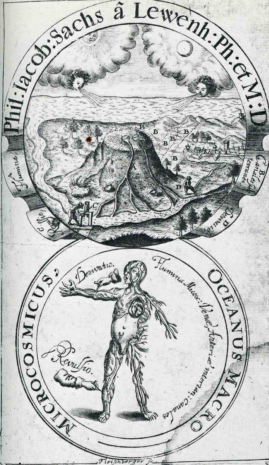 Notes: (Sachse de Lewenheimb, Philipp Jakob Sachs, 1627-1672 , Oceanus macro-microcosmicus, seu Dissertatio epistolica analogo motu aquarum ex et ad Oceanum, sanguinis ex et ad cor... 1664, with full text via Google books here).