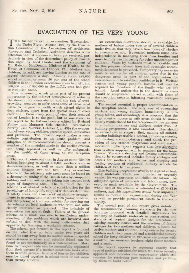 It is good to remember the early part of the war and the efforts made by the people of Great Britain, and their sacrifices, This notice appeared in the November 2, 1940 issue of Nature which recounts the evacuation measures of children during the Battle of Britain. By this point more than half of the school children in the London evacuation areas had been been evacuated, with nearly a million leaving altogether in a total evacuated population of some 3.5 million people. (At the very beginning of the war there was also an evacuation program for Jewish children from Germany to England--this was the Kindertransport which brought some 10,000 children to safety.) It was a sort of reverse/anti "Children's Crusade" (as in the subtitle for Kurt Vonnegut's Slaughterhouse Five), where rather than an army of children sent to expel or convert Muslims from Jerusalem/Holy Land in the 13th century, the children were sent to safety away from a crusade against their homeland. The major difference besides the existence of their opposition is that this evacuation was real, and the so-called "Children's Crusade" was not.