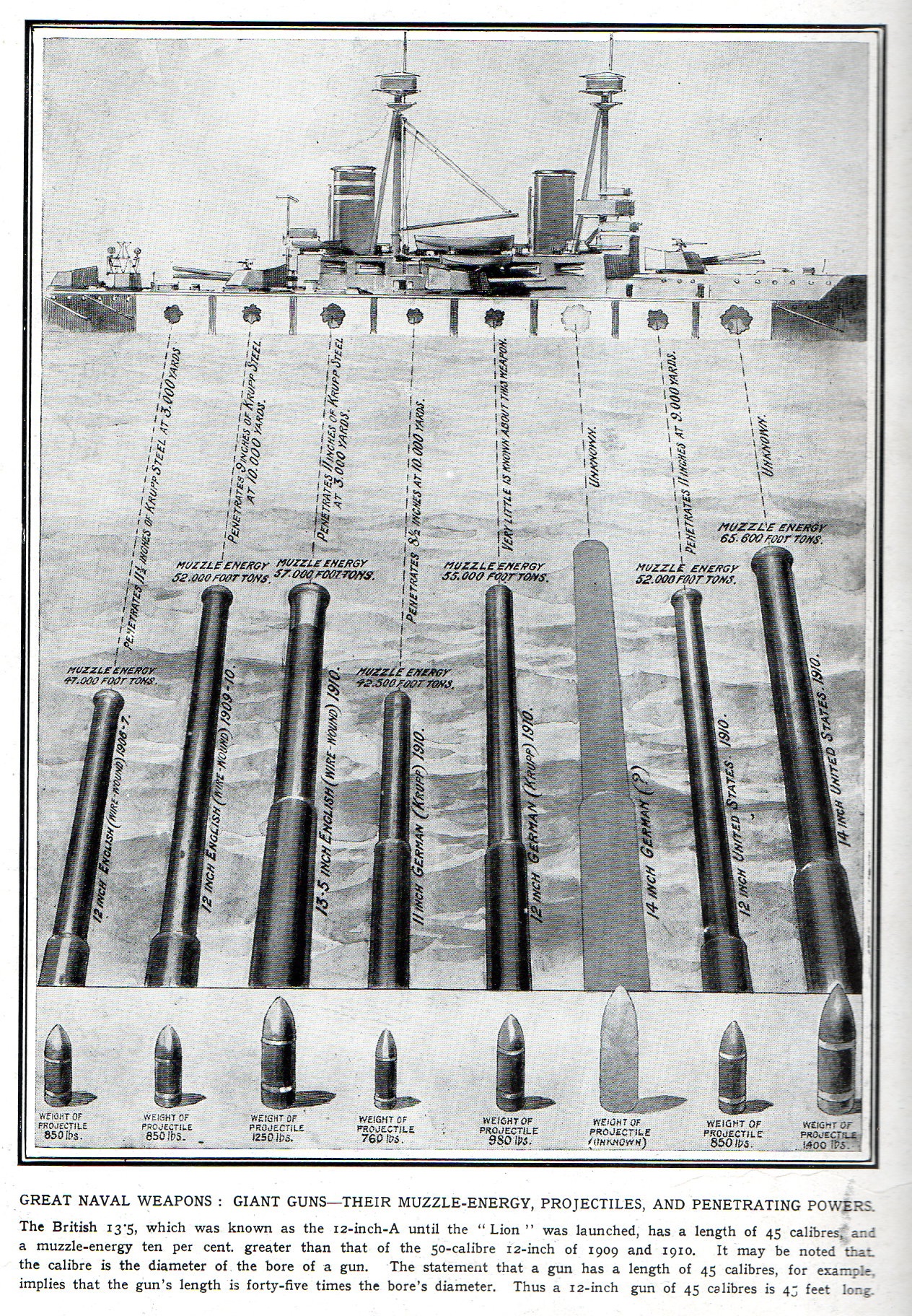 I found this lovely infographic in the August 29, 1914 issue of The Illustrated London News, coming a little more than three weeks after the beginning of WWI. It is one of the earliest issues almost fully dedicated to war coverage, and in its many articles covers the fall of Namur, the fight at Mons, the destruction of the HMS Amphion, and images of long lines of Belgian refugees, the fight at Haelen (and the dog-drawn heavy machine guns), and the first drawing of the BEF in action in France. The image below addresses what was seen early on as the war's premier issue in military strength, which was seen in the power of navies, and hence the depiction of the relative "strengths" (projectile weight (760-1400 lbs), barrel length, "muzzle energy", steel penetration) of the big shells: