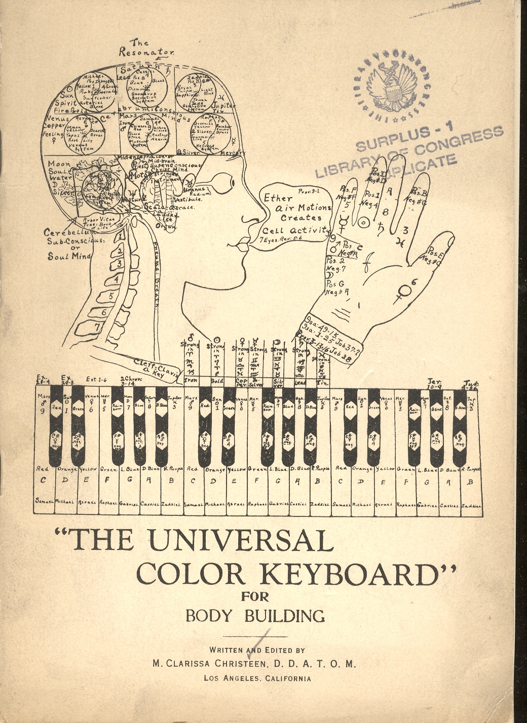 This last bit is probably the case for W. Clarissa Christeen’s (“D.D.A.T.O.M.”)The Universal Color Keyboard for Body Building, published in beautiful Los Angeles in 1925. In the many eyebrow-raising and vastly unexpected segments that she manages to share in her thin pamphlet she certainly strays into many unknown conclusion-processes and uniquely personal observations about the physical and spiritual world, testing the reader's patience in many ways in 16 pages. But what Ms. Christeen absolutely does have going for her is her and which is easily appreciated is her artwork, which is, in its own special way, quite sensational—I’m really sorry that the pamphlet is limited to only two pieces of her work, as I’d really like to see more.